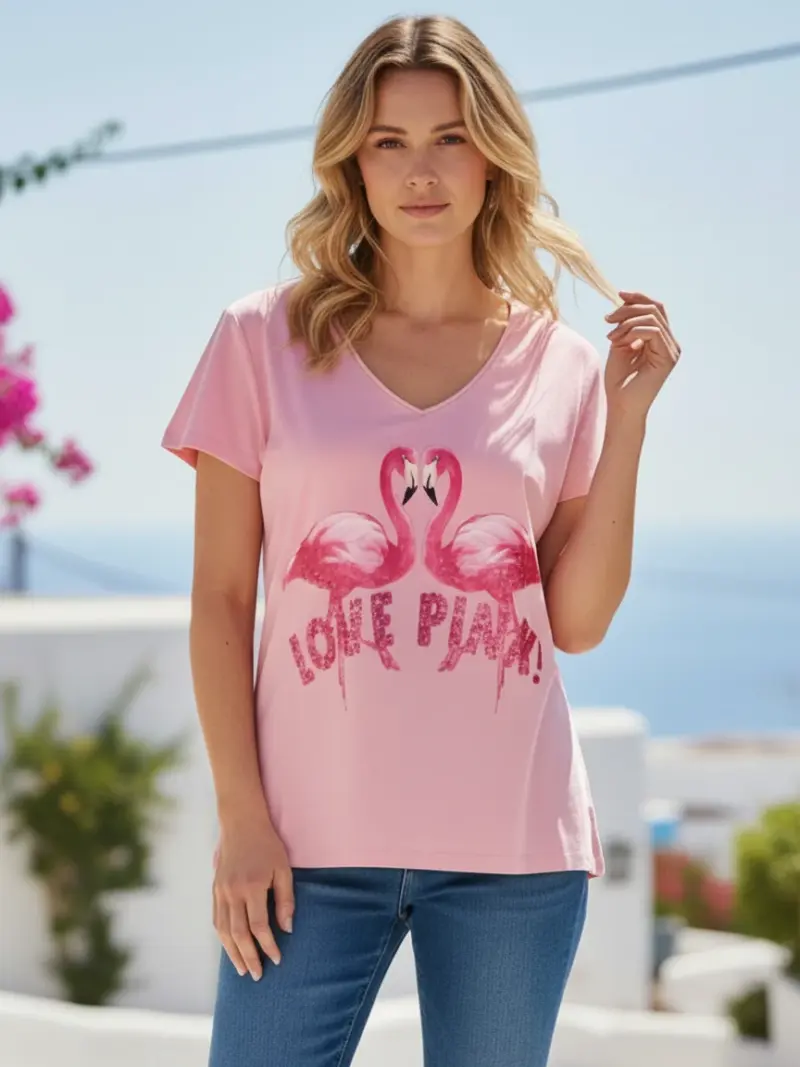 T-Shirt V-Neck Flamingo Love Pink - rose