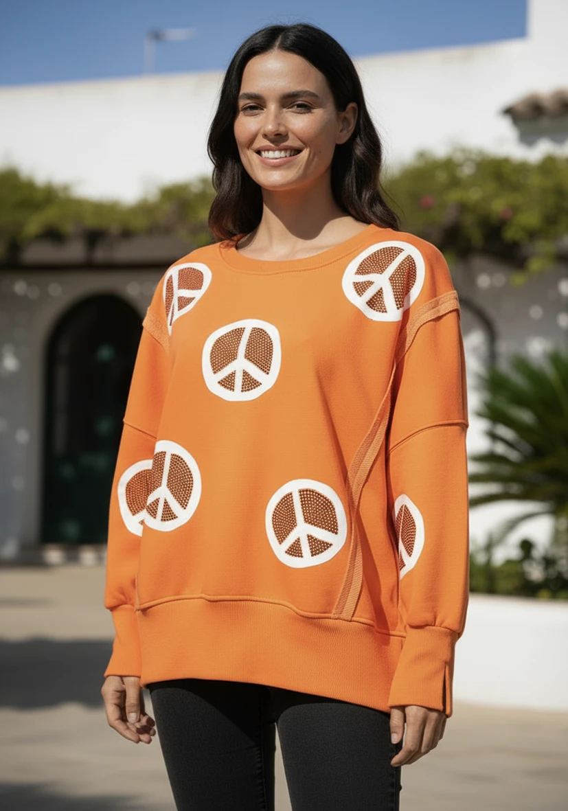 Rento neulepusero, jossa on pyöreä pääntie ja moderni rauhankuvio. Kimaltelevat strassikivet lisäävät tyylikkäitä yksityiskohtia. Leveät hihansuut ja kontrastiväriset koristesaumat takaavat laadukkaan ilmeen. Mukava päällä.