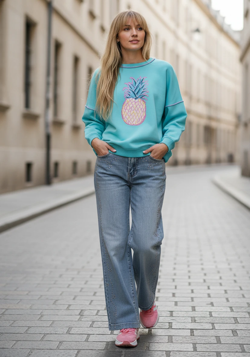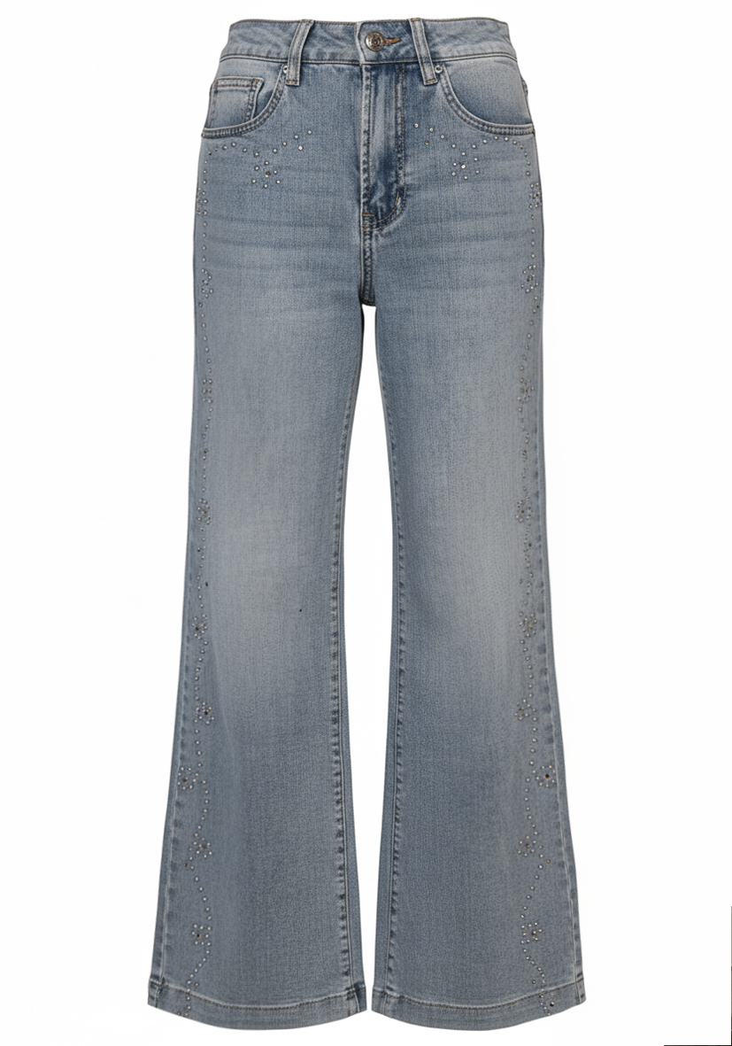 Deze jeans imponeert met zijn relaxte pasvorm en klassieke blauwe wassing. De strass-steentjes zijn een echte blikvanger. Perfect voor stijlvolle casual looks met een unieke twist.