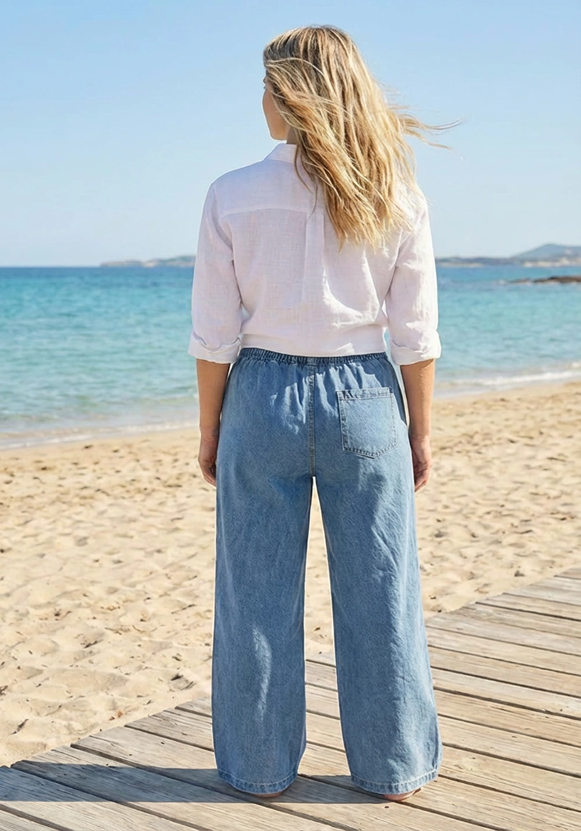 Diese Hose überzeugt mit ihrer weiten, fließenden Silhouette und einem modernen, entspannten Look. Das leichte Denim-Material sorgt für ein angenehmes Tragegefühl, ideal für warme Tage. Vielseitig kombinierbar ist sie ein perfekter Begleiter für lässige und stilvolle Sommer-Outfits.