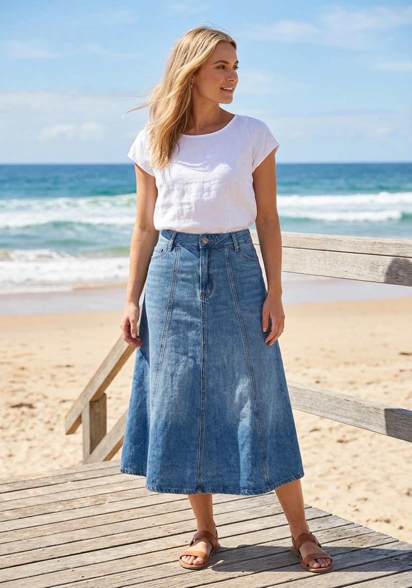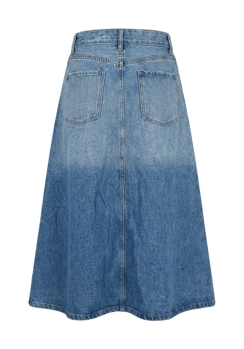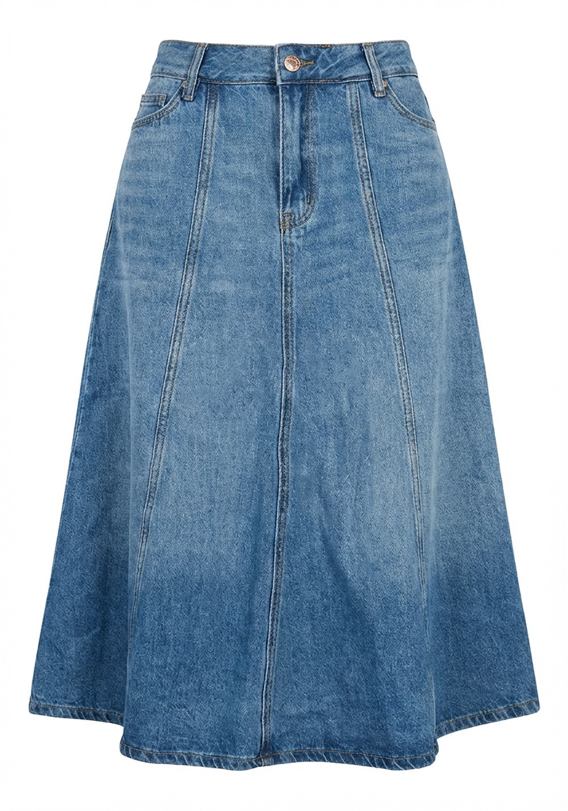 - Feminint midi-denimskjørt med en lett utsvingt A-linjeformet silhuett