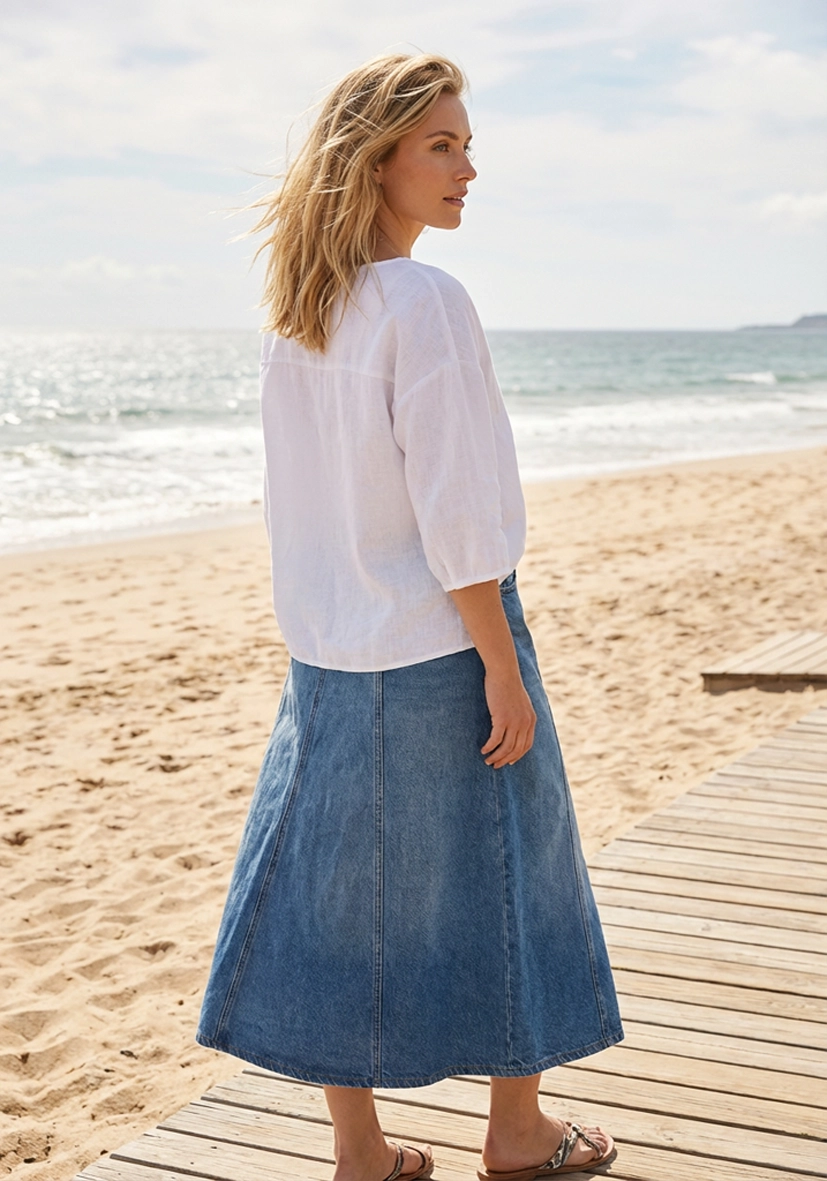 Dette midi-denimskjørtet imponerer med sin feminine A-linjeformede silhuett og tidløse denim-look. Den høye midjen og de subtile sømmene skaper en flatterende, moderne silhuett. Skjørtet er perfekt for varme dager og kan styles på mange måter – fra avslappet til elegant.