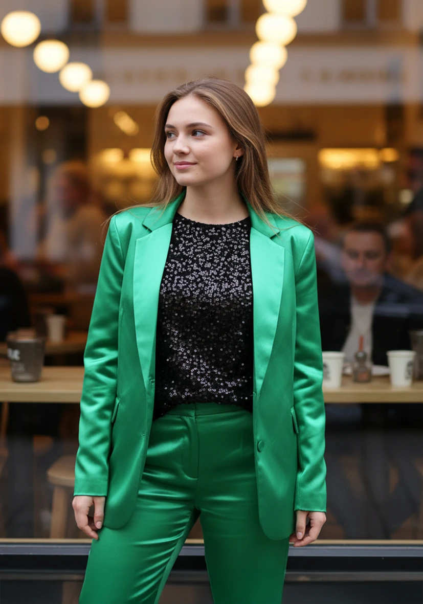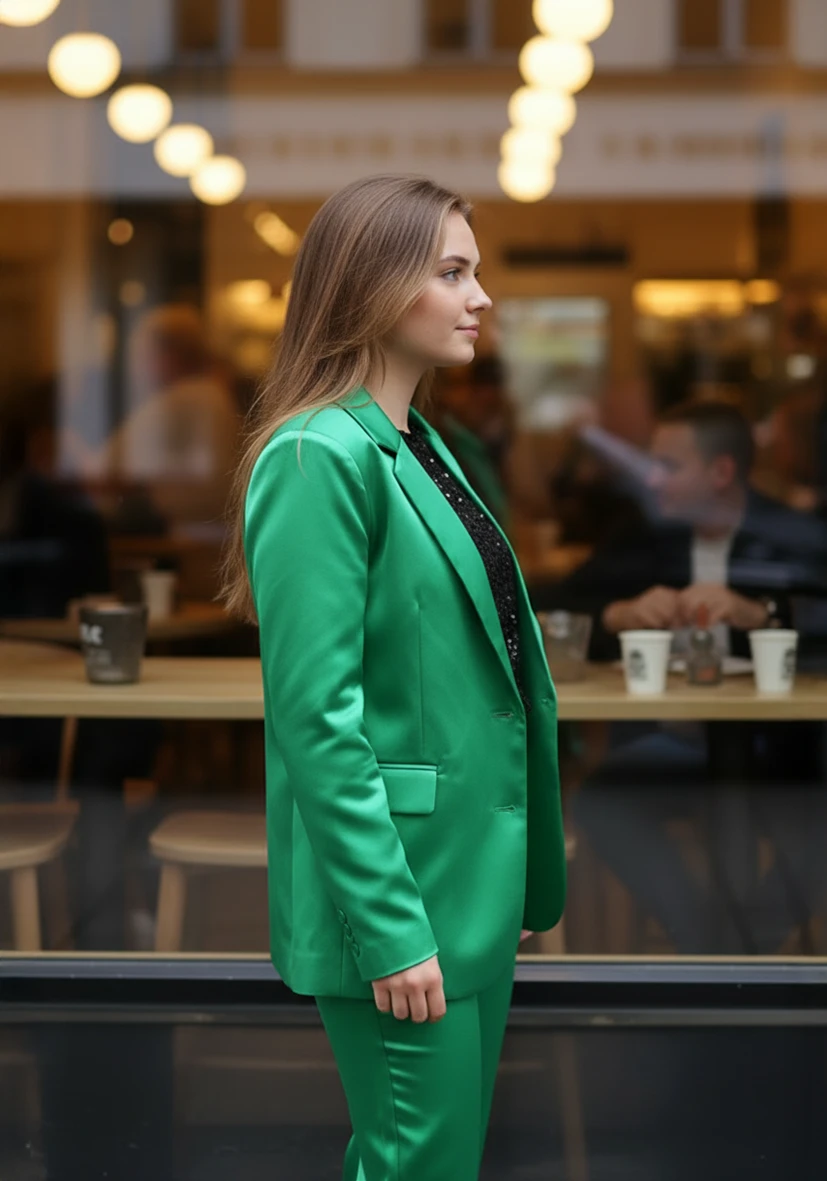 Eleganter Blazer im klassischen Schnitt aus seidig glänzendem Material. Mit schmalem Reverskragen, seitlichen Taschen, Knopfverschluss und gemustertem Futter – der perfekte Begleiter für stilvolle Outfits.