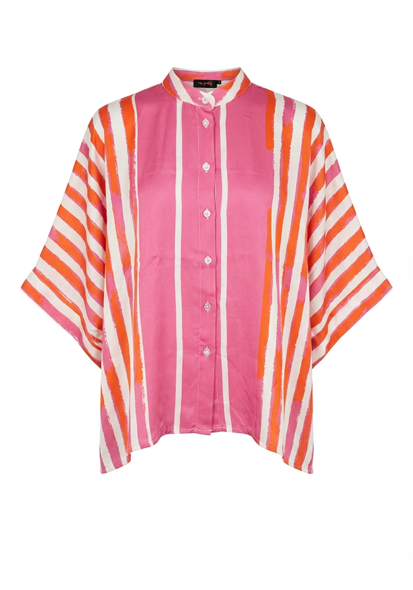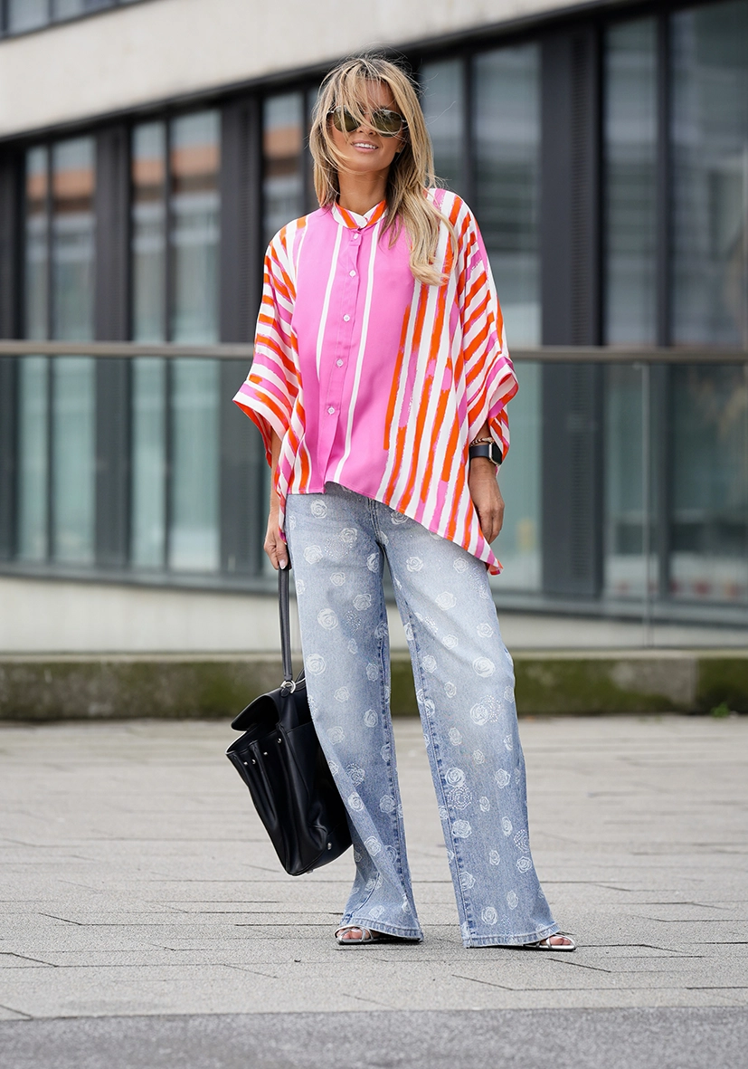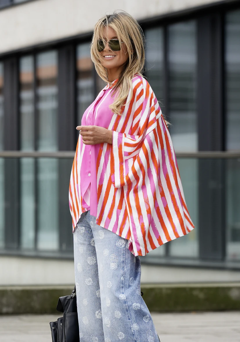 Diese luftige Bluse überzeugt mit ihrem farbenfrohen Streifenmuster in Pink- und Orangetönen und sorgt sofort für gute Laune im Outfit. Die lockere Passform mit überschnittenen Ärmeln bietet hohen Tragekomfort und einen modernen, entspannten Look. Dank der durchgehenden Knopfleiste und dem stilvollen Stehkragen lässt sich die Bluse vielseitig kombinieren – von casual bis chic.