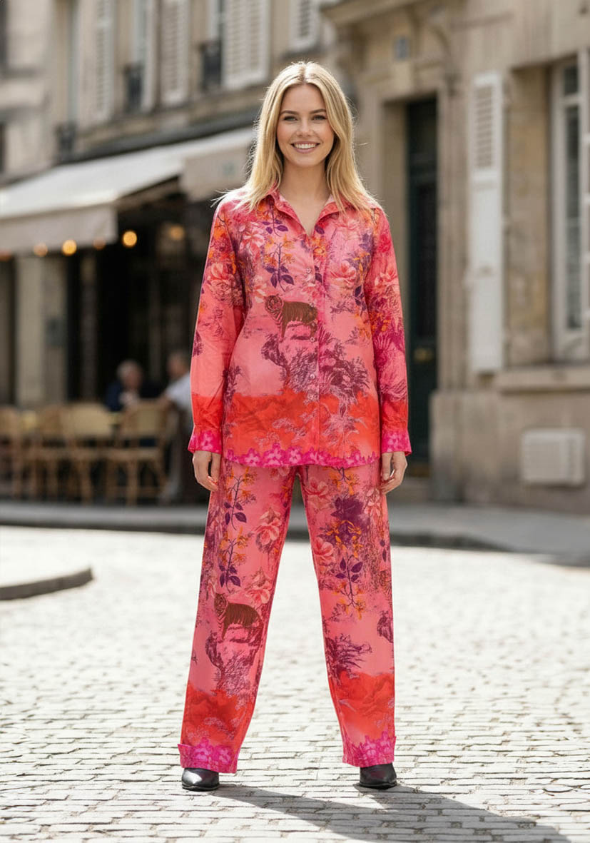 Fließende weiche Viskosebluse mit wunderschönem Print im auffälligem Kontrastspiel in unterschiedlichen Pinktönen. Klassischer Kentkragen mit durchgehender verdeckter Knopfleiste. Lässiger Schnitt für den Alltag oder besondere Anlässe – je nach Kombination.