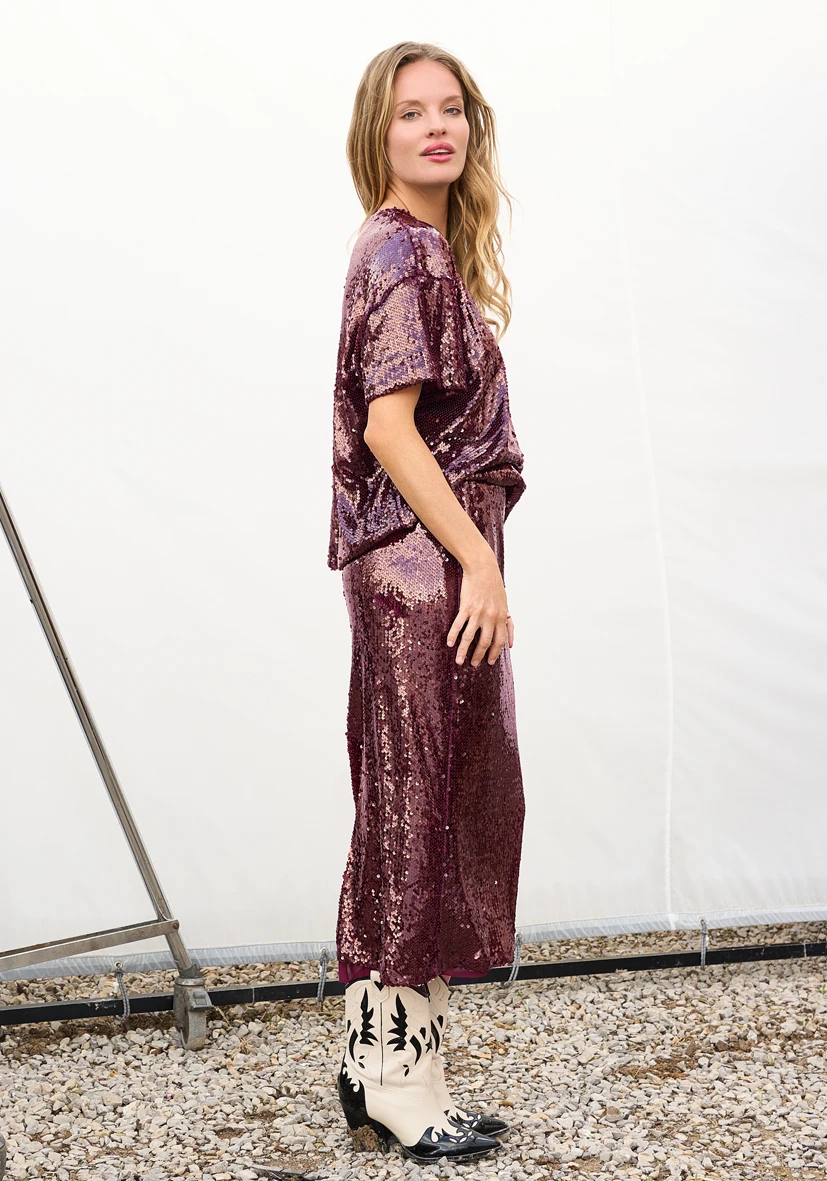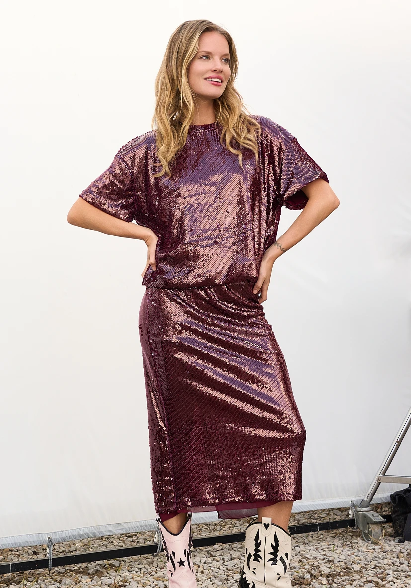 Gerader, femininer Rock, komplett mit funkelnden Pailletten besetzt. Mit elastischem Bund und Rückenschlitz für bequemen Sitz und stilvollen Auftritt.