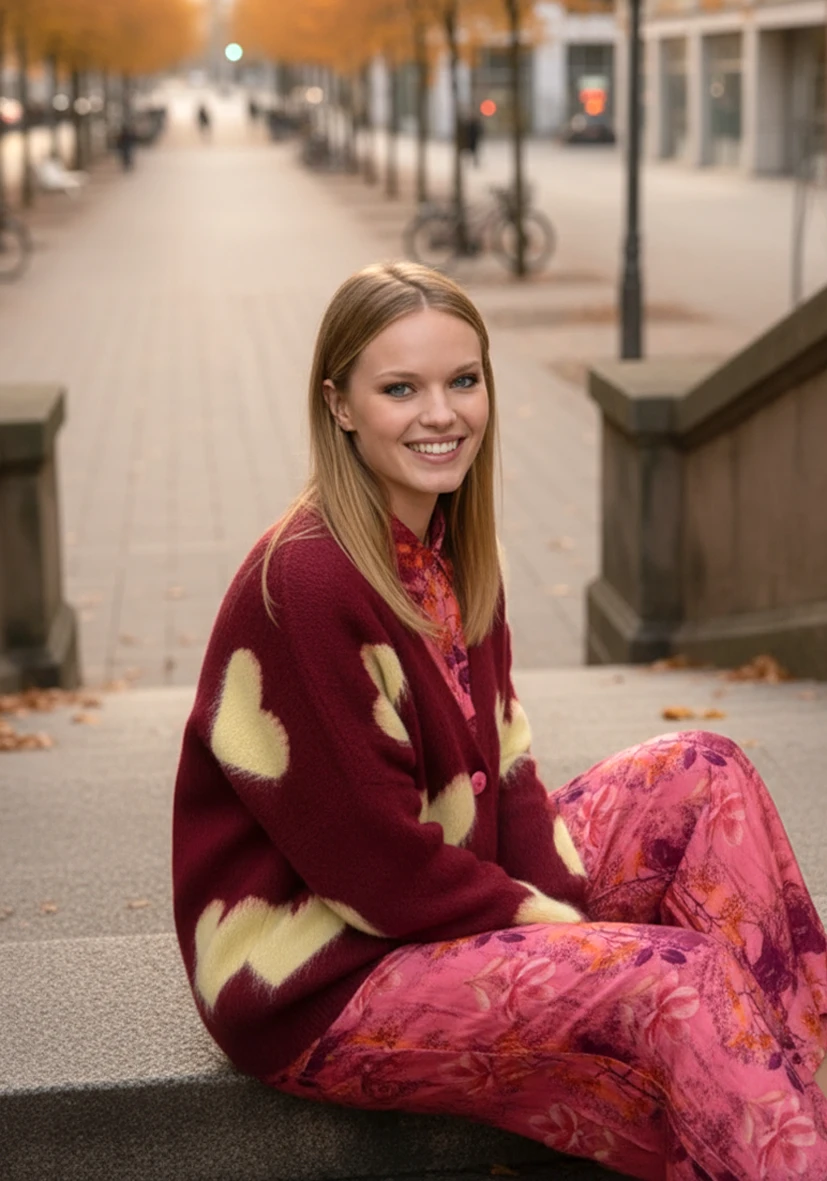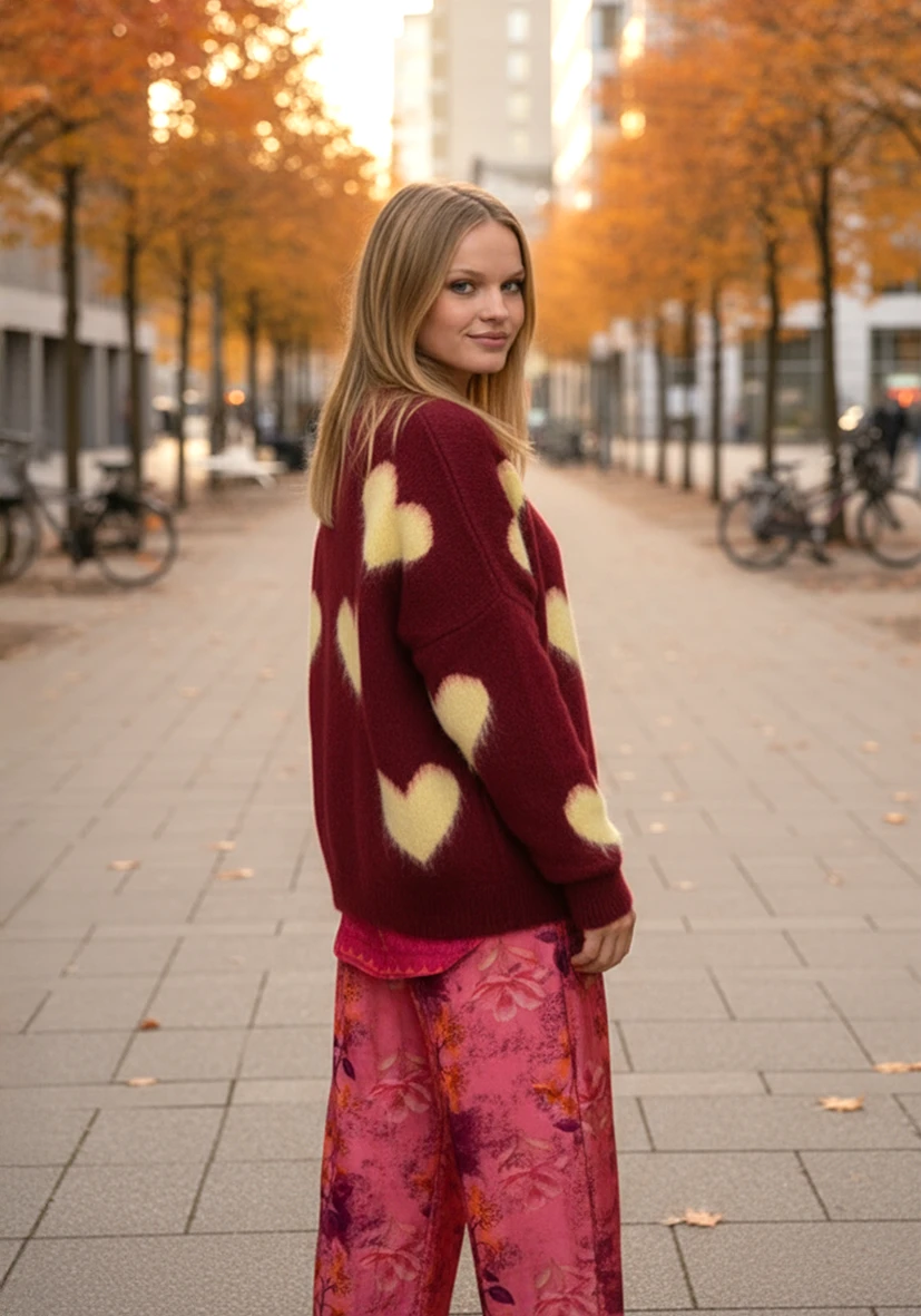 Weicher Cardigan aus gebürsteter Wollmischung mit bordeauxfarbenem Grundton und eingestrickten hellgelben Herzmotiven. Der V-Ausschnitt und die Knopfleiste verleihen einen charmanten, femininen Look.