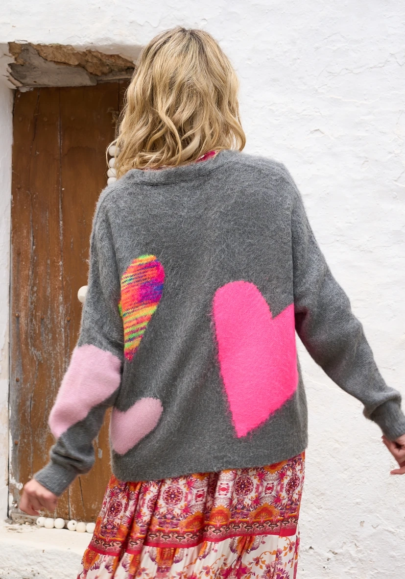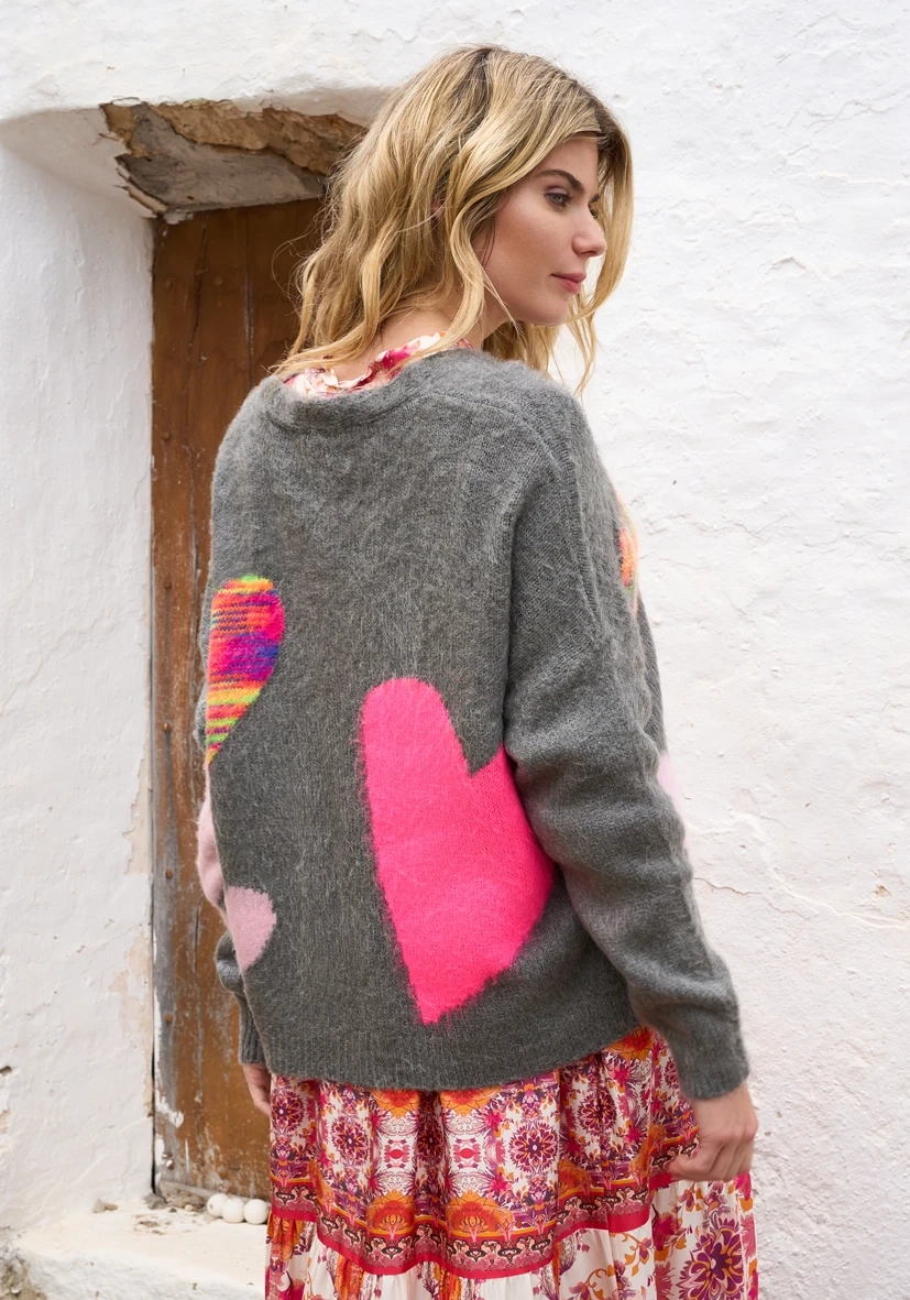 Flauschige Strickjacke in Grau mit charmantem Herz-Intarsienmotiv. Die lockere Passform, der Rundhals-Ausschnitt und die weiche Strickqualität garantieren entspannten Tragekomfort – ideal für kühle Tage.