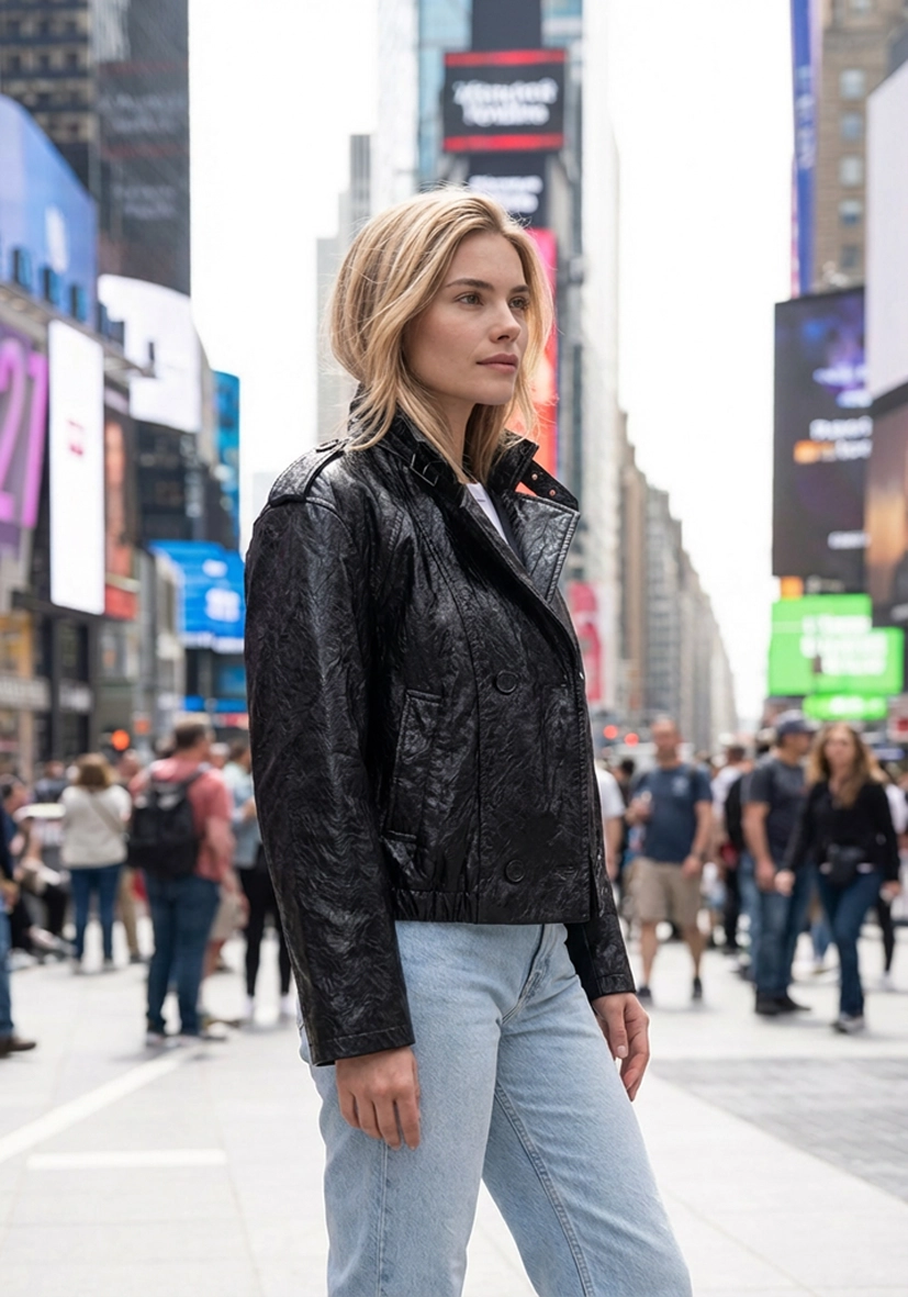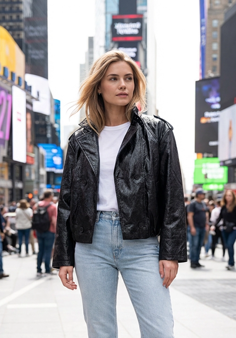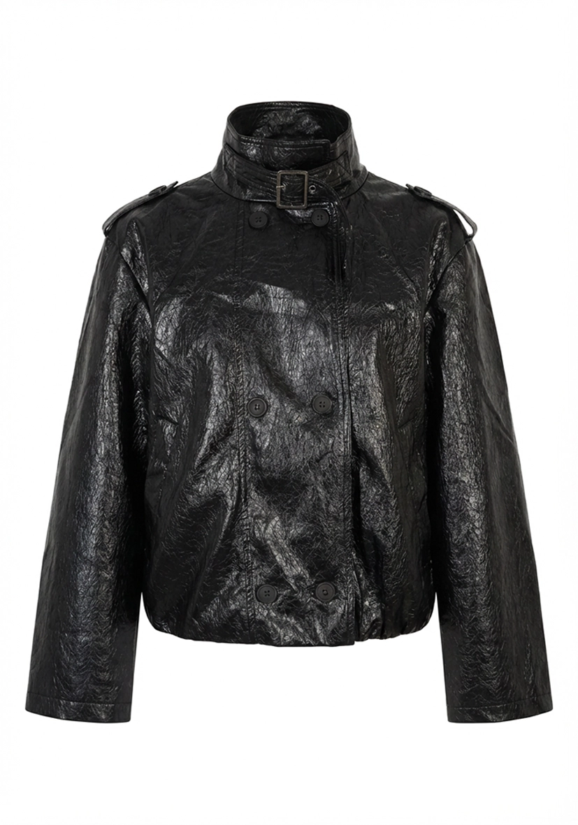 Diese Kurzjacke überzeugt mit ihrer edlen Lederoptik und einem modernen, femininen Design. Der Stehkragen mit Schnalle und die doppelte Knopfleiste setzen stilvolle Akzente und verleihen dem Look eine besondere Raffinesse. Perfekt für die Übergangszeit lässt sich die Jacke vielseitig kombinieren und rundet jedes Outfit elegant ab.