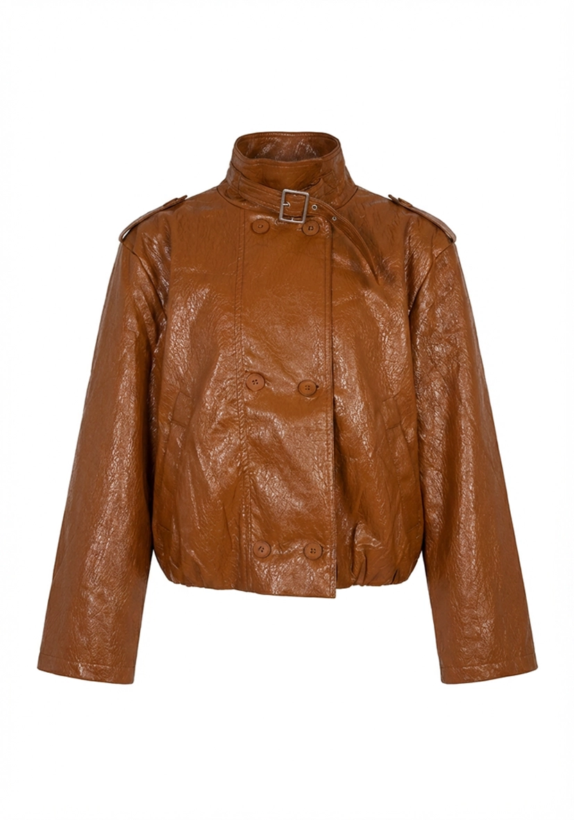 Diese Kurzjacke überzeugt mit ihrer edlen Lederoptik und einem modernen, femininen Design. Der Stehkragen mit Schnalle und die doppelte Knopfleiste setzen stilvolle Akzente und verleihen dem Look eine besondere Raffinesse. Perfekt für die Übergangszeit lässt sich die Jacke vielseitig kombinieren und rundet jedes Outfit elegant ab.
