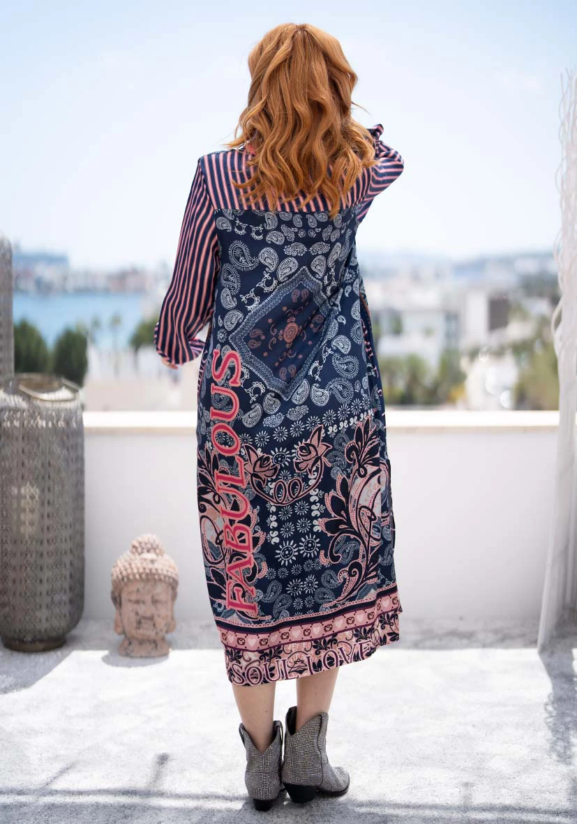 Tunika-Kleid mit langen Ärmeln und Stehkragen mit V-Ausschnitt und Knopfleiste. Seitlich geschlitzt, mit Bindegürtel zur Taillenregulierung und praktischen Eingrifftaschen.
