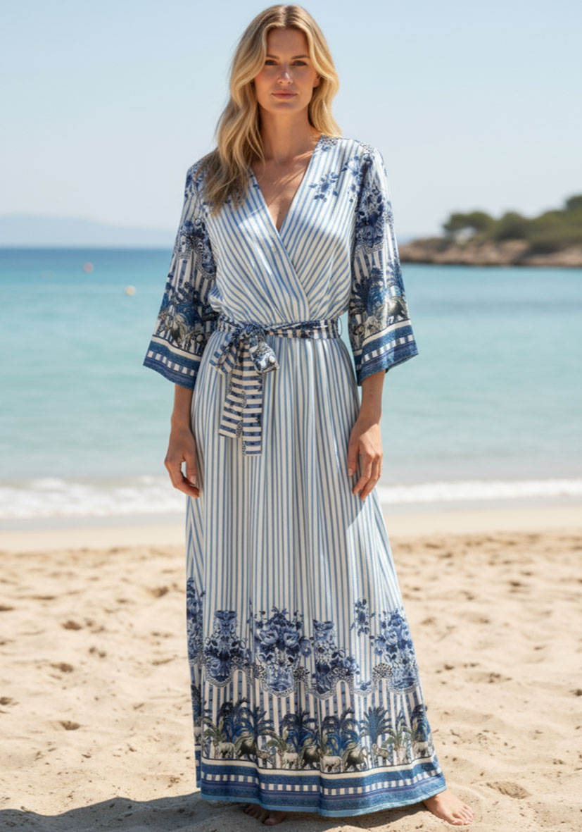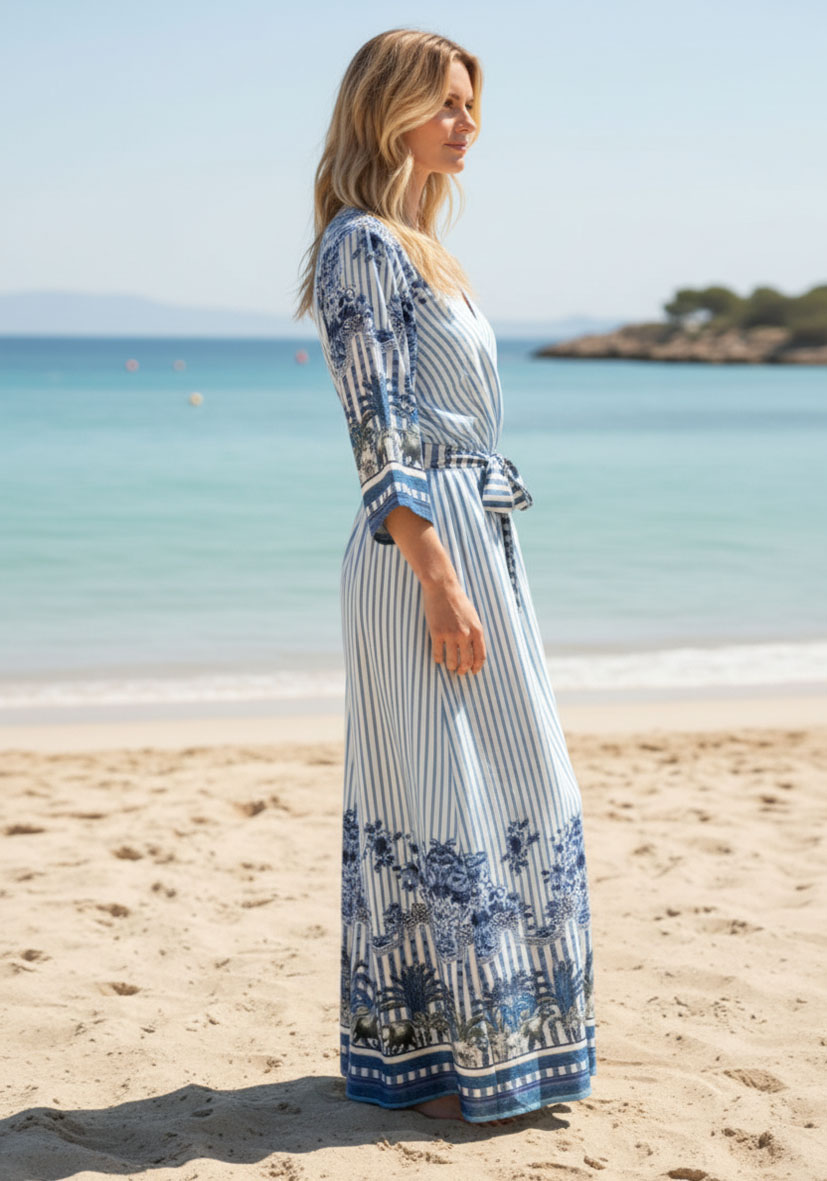 Elegantes Kleid mit 3/4-Ärmeln und V-Ausschnitt in Wickel-Optik. Seitliche Taschen und ein Bindegürtel in der Taille sorgen für eine feminine, bequeme Passform.