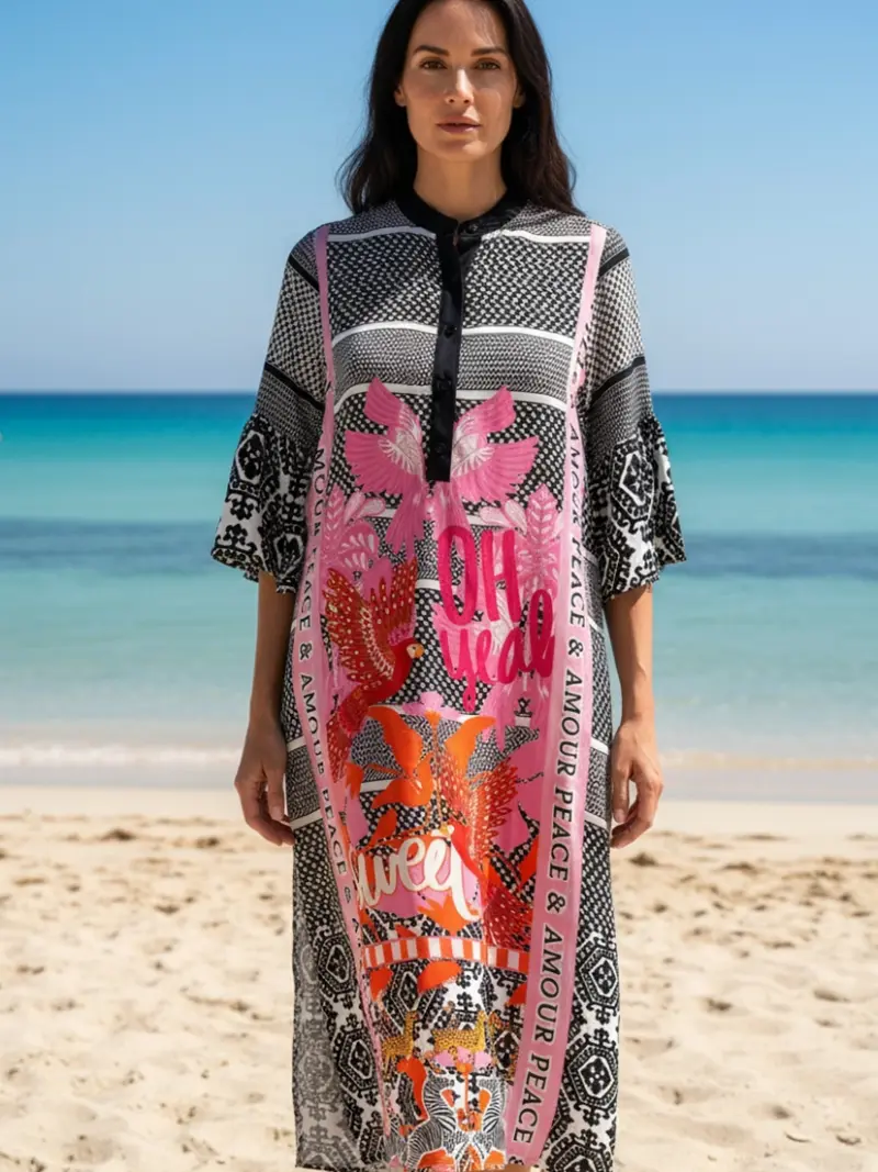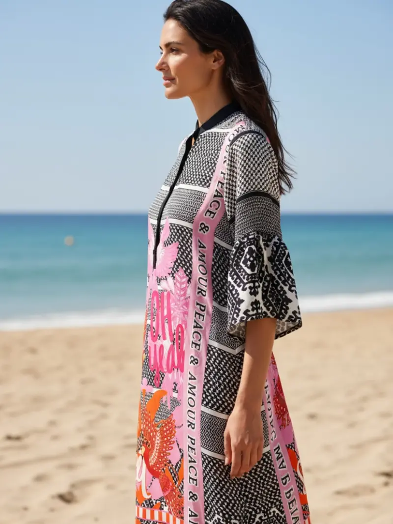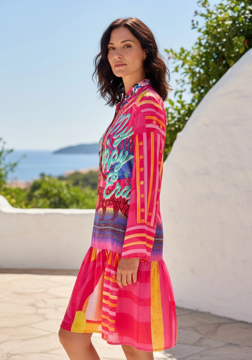 Feminines Midi-Kleid mit Trompeten-Ärmeln und Volant-Stufe für eine fließende Silhouette. Der V-Ausschnitt mit kleinem Stehkragen und Knopfleiste setzt einen stilvollen Akzent.