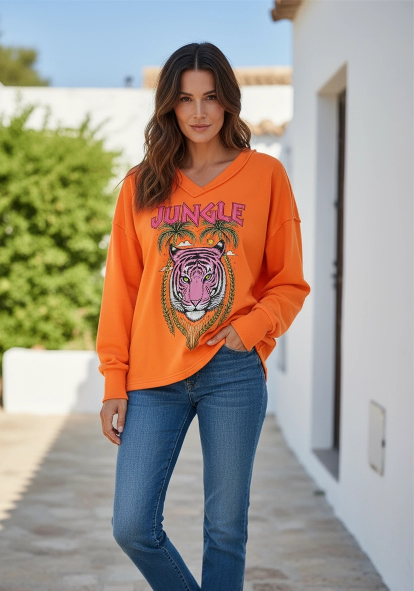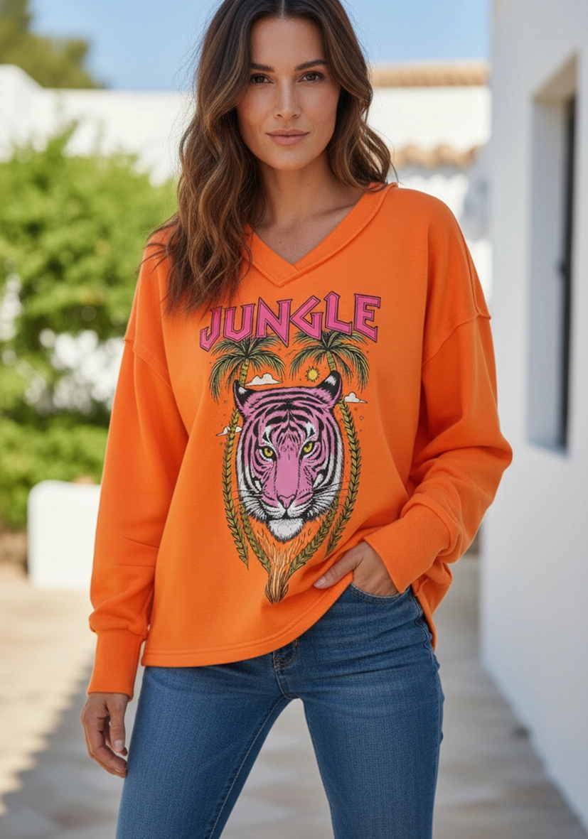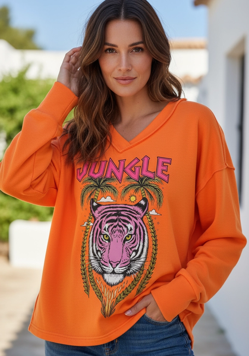 - auffälliger Frontprint mit Tiger-Motiv und „JUNGLE“-Schriftzug