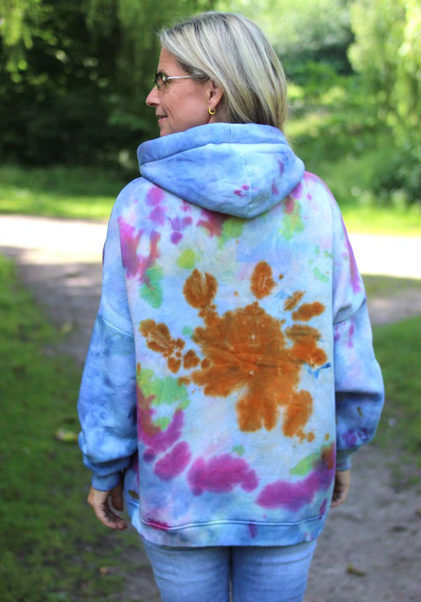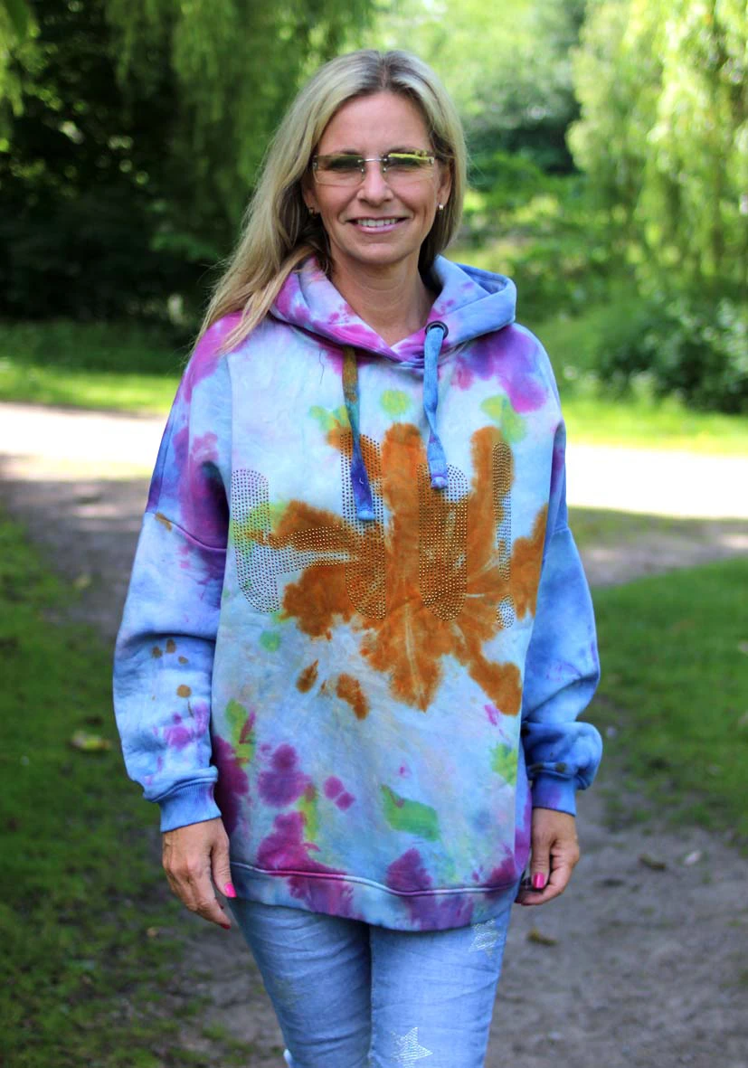 Hoodie mit breiten Kapuzenbändchen, Batik-Färbung rose, vorn großflächige Strass-Applikation, klassischer Schnitt, Batik rose, 100 % Baumwolle
