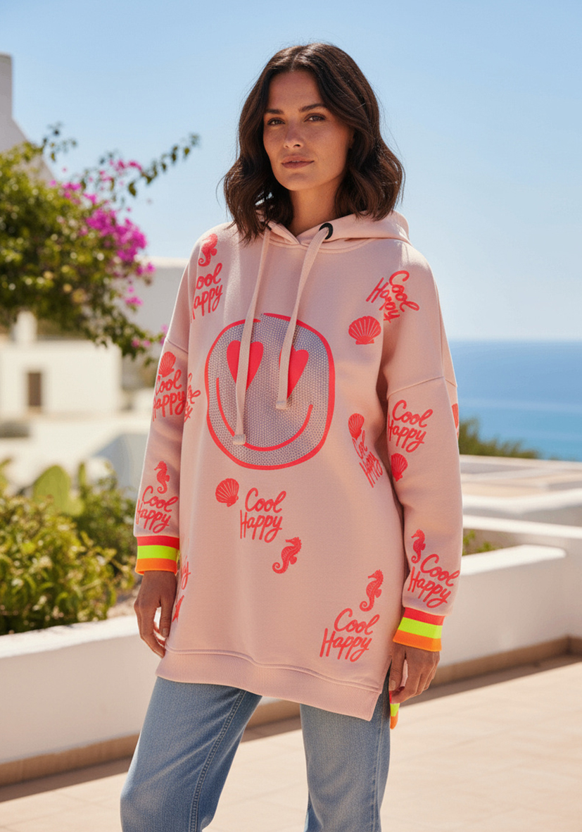 Oversized Hoodie im Long Fit in rosa mit auffälligem neonfarbenem Print und Strass. Extra lang geschnitten und seitlich geschlitzt für optimalen Tragekomfort. Mit praktischen seitlichen Taschen – lässig kombinierbar zu Jeans, Leggings oder auch als modisches Sweatshirtkleid.