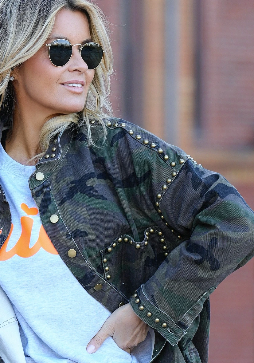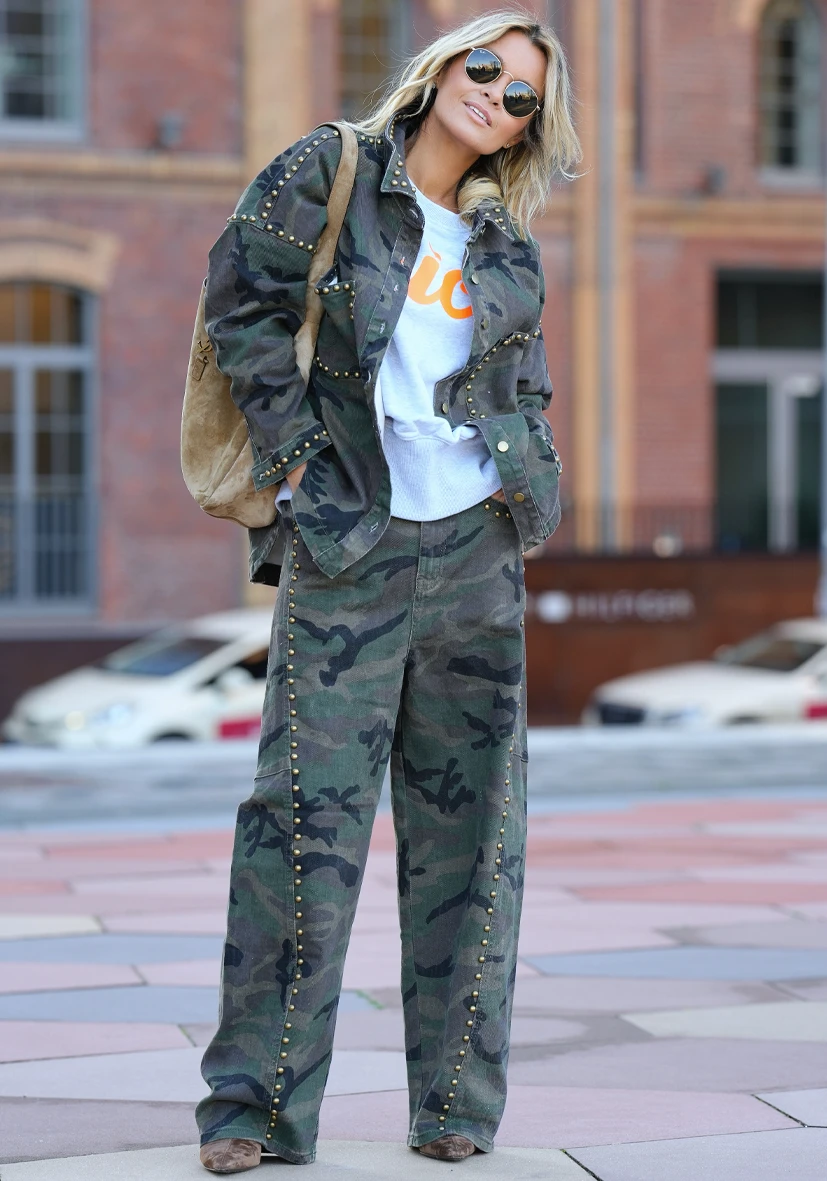 Lässige Jeansbluse in trendigem Camouflage-Muster mit coolen Metall-Nieten. Locker geschnitten, durchgehende Knopfleiste und Hemdkragen für einen modernen Denim-Look.