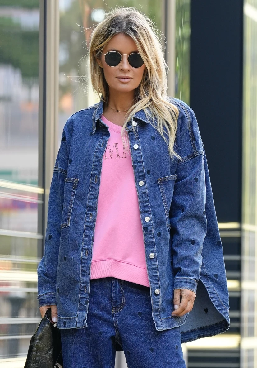 Lässige Jeansbluse in blau mit aufgenähten Herz-Details. Locker geschnitten, durchgehende Knopfleiste und Hemdkragen für einen modernen Denim-Look. Vielseitig kombinierbar – perfekt zu Jeans, Röcken oder Lederhosen. Auch als Jeansjacke tragbar.