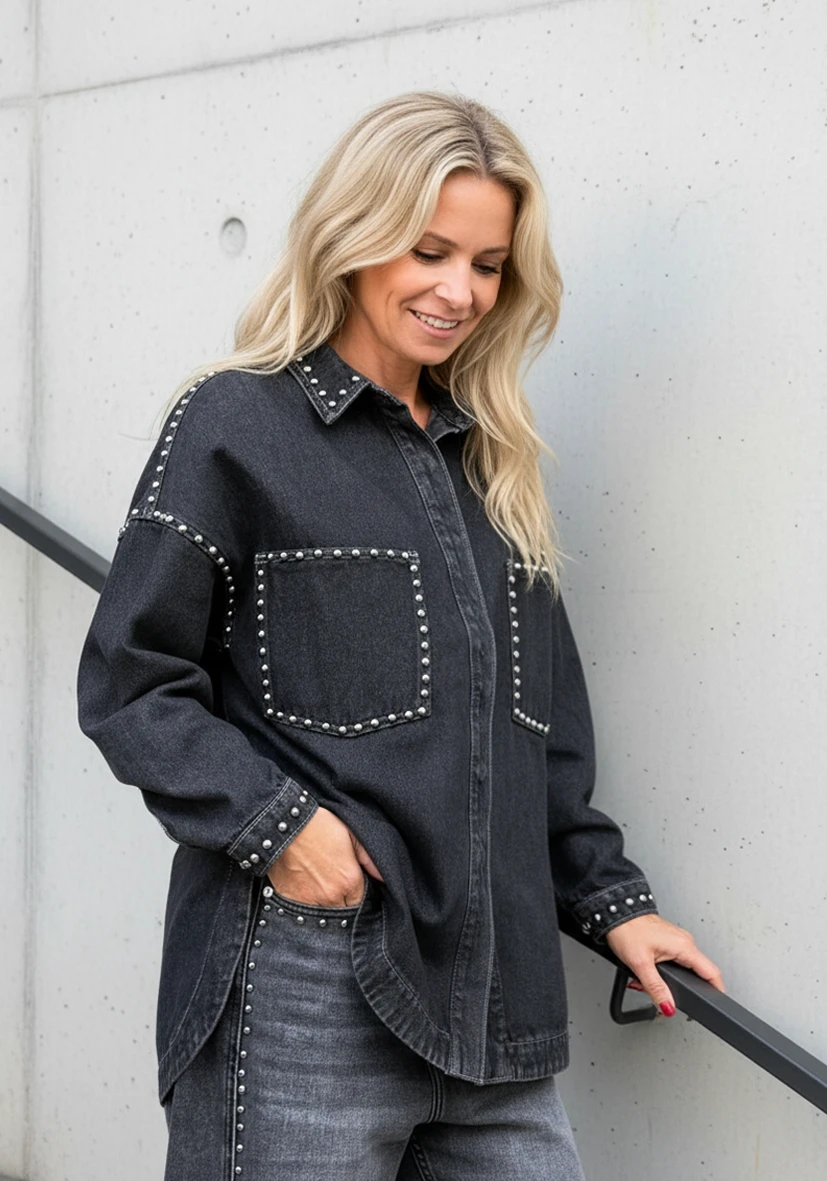 Jeanshemd mit Kugelnieten in Grau. Gerader, luftiger und komfortabler Schnitt. Der weiche Denim fällt locker und schmeichelt der Figur. Die abgerundeten Seitennähte und die verdeckte Druckknopfleiste verleihen der Denim Bluse einen Hauch Eleganz.