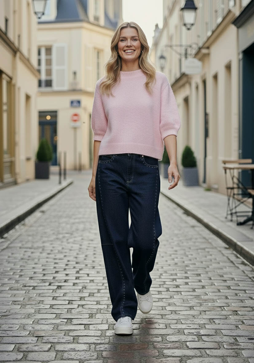 Leichter, kuscheliger Strickpullover mit Rundhalsausschnitt und lässigem Schnitt. Überschnittene Schultern und leicht bauschige Dreiviertel-Ärmel. Breite Rippstrickbündchen an Ärmeln und Saum.