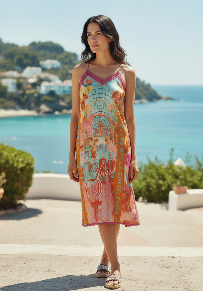 Dieses ärmellose Sommerkleid überzeugt mit einem farbenfrohen Print. Der V-Ausschnitt mit pinker Spitze sorgt für einen femininen Look. Der leichte Stoff macht es zum perfekten Begleiter für warme Tage.
