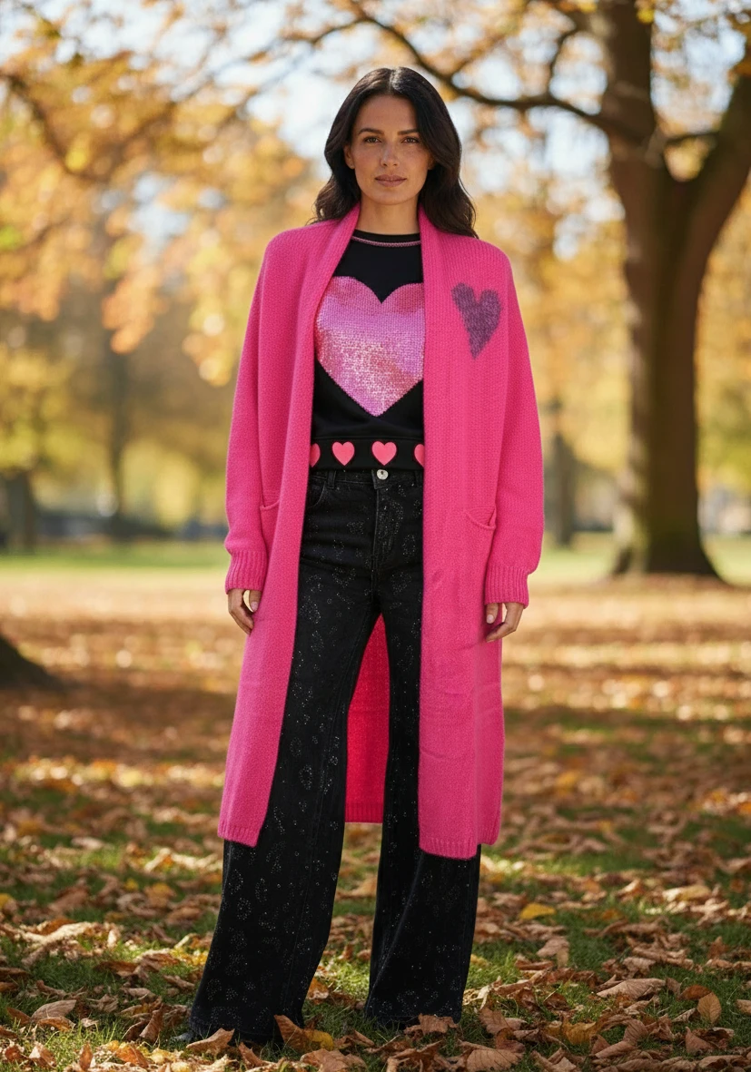 Langer Strick-Cardigan in Neonpink mit lässigem Oversize-Schnitt und einem großen eingestricktem Herz auf der Rückseite. Die weiche Wollmischung sorgt für wohlige Wärme und ein angenehmes Tragegefühl, der offene Schnitt und die aufgesetzten Taschen für entspannte Lässigkeit.
