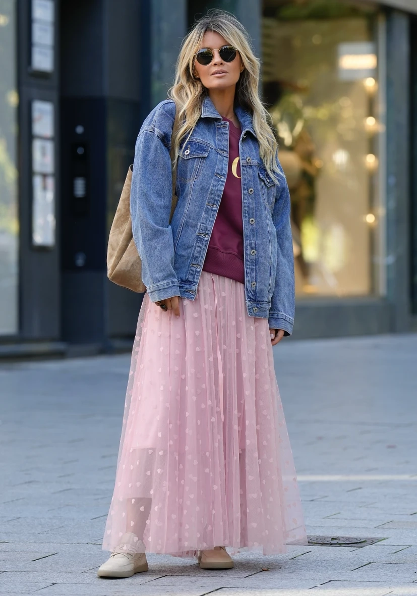Dieser Tüllrock in Rosa begeistert mit einem verspielten, eingewebten Herz Design und einem weich fließenden Tüllstoff. Die semitransparente Optik und die schwingende Silhouette machen ihn zum idealen Begleiter für romantische Styles und besondere Momente.