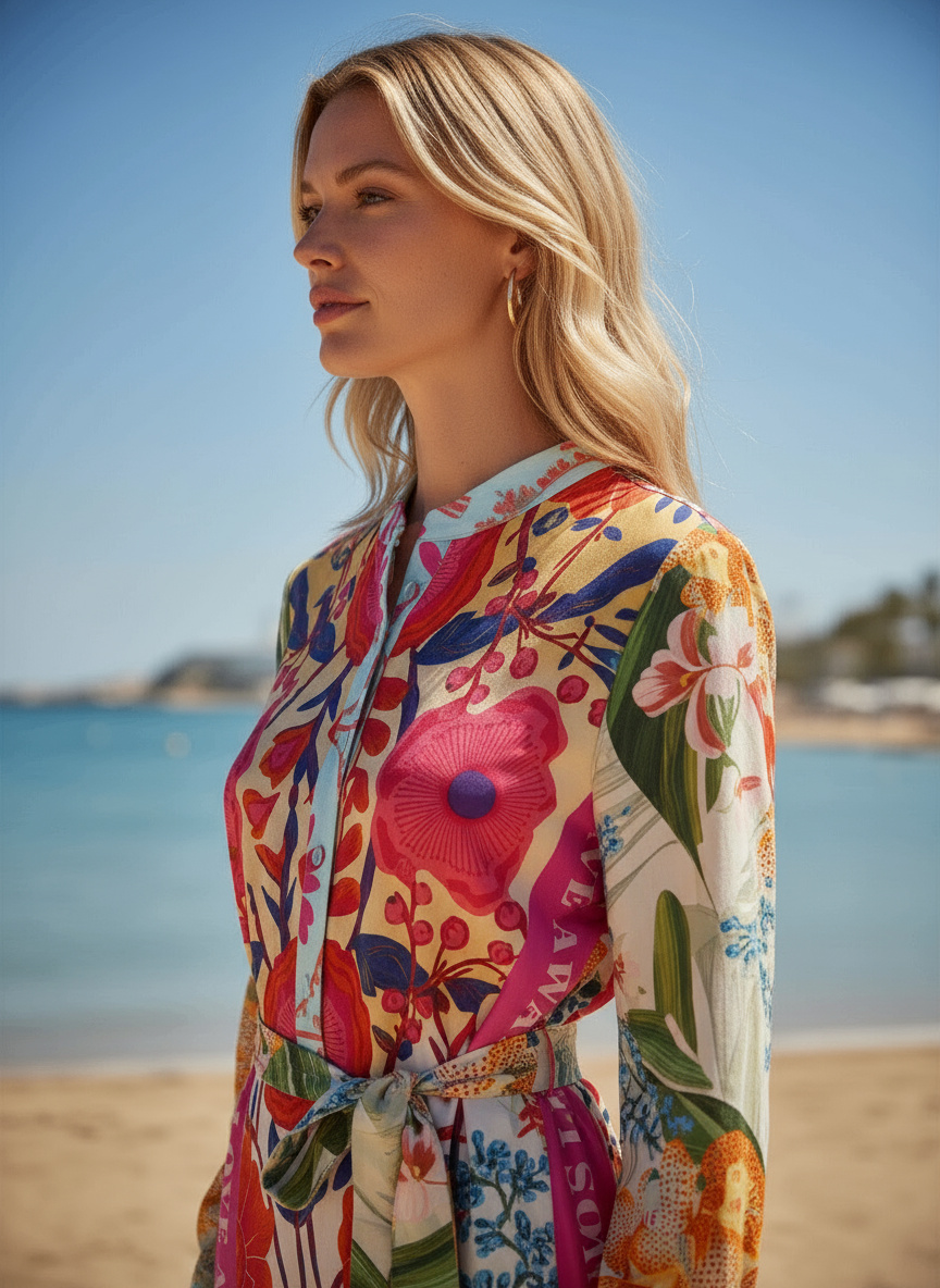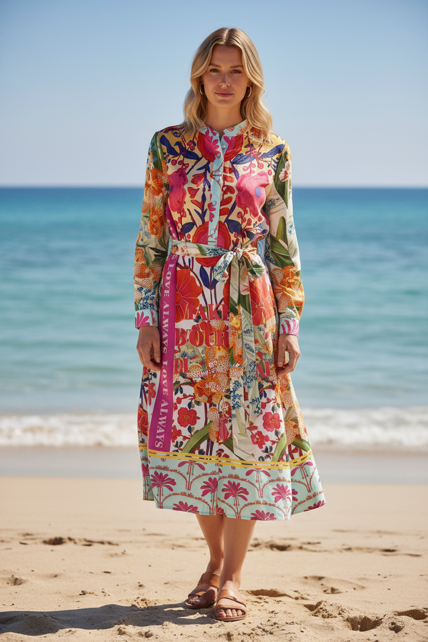 Dieses Kleid überzeugt mit einem lebendigen, floralen Print und einem stilvollen Hemdblusen-Design. Der Bindegürtel betont die Taille und sorgt für eine feminine Passform, während das leichte Material angenehm zu tragen ist. Perfekt für sonnige Tage – ob am Strand oder in der Stadt.