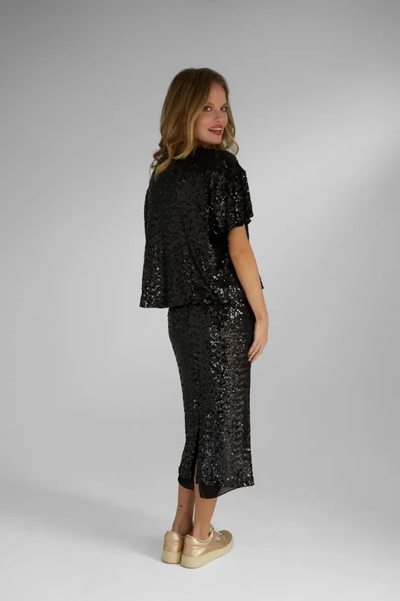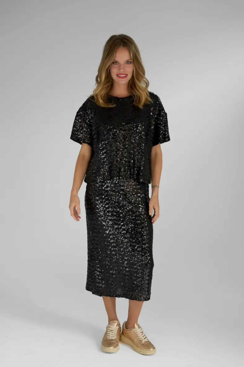 Das Noir Paillette Shirt bringt funkelnden Glamour in jeden Look. Komplett mit Pailletten in elegantem Schwarz besetzt, wird es zum stilvollen Eyecatcher für besondere Momente.