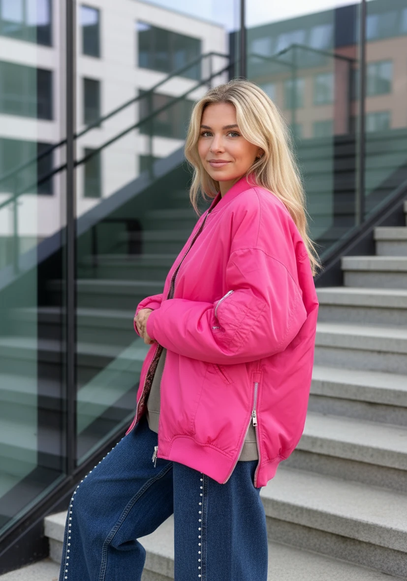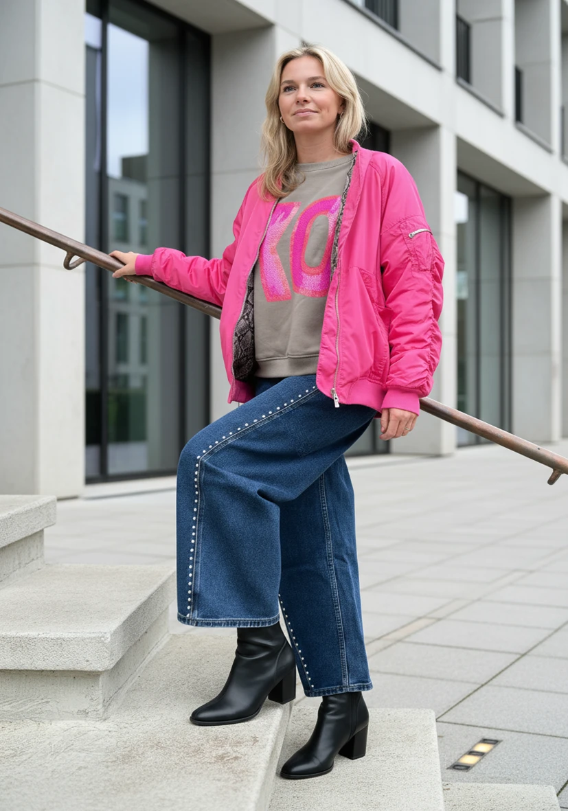 Leicht gefütterte Bomberjacke. Das Innenfutter ist in angesagtem Schlangenmuster. Der oversized Schnitt mit seitlichen Zippern, Ärmeltasche und großen Pattentaschen macht sie zum perfekten Statement-Piece für jeden Tag.