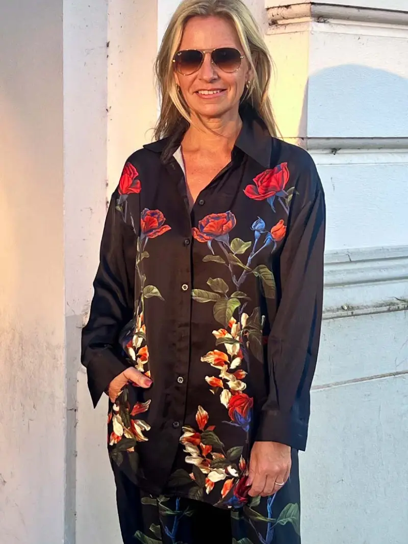 119,90 €Kentkragen mit durchgängiger Knopfleiste, Rückenfalte und abgerundeter Saum, etwas längeres Rückenteil, leichte Ballonärmel, schwarz, 100 % Viskose-Satin -