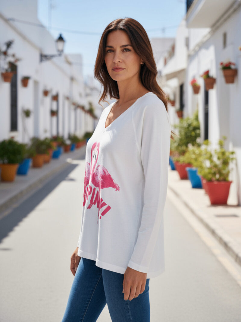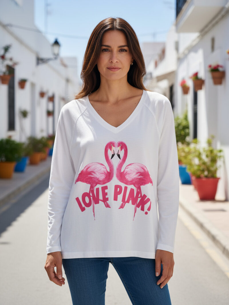 weites Bein mit pinken Ziernähten seitlich und am Saum