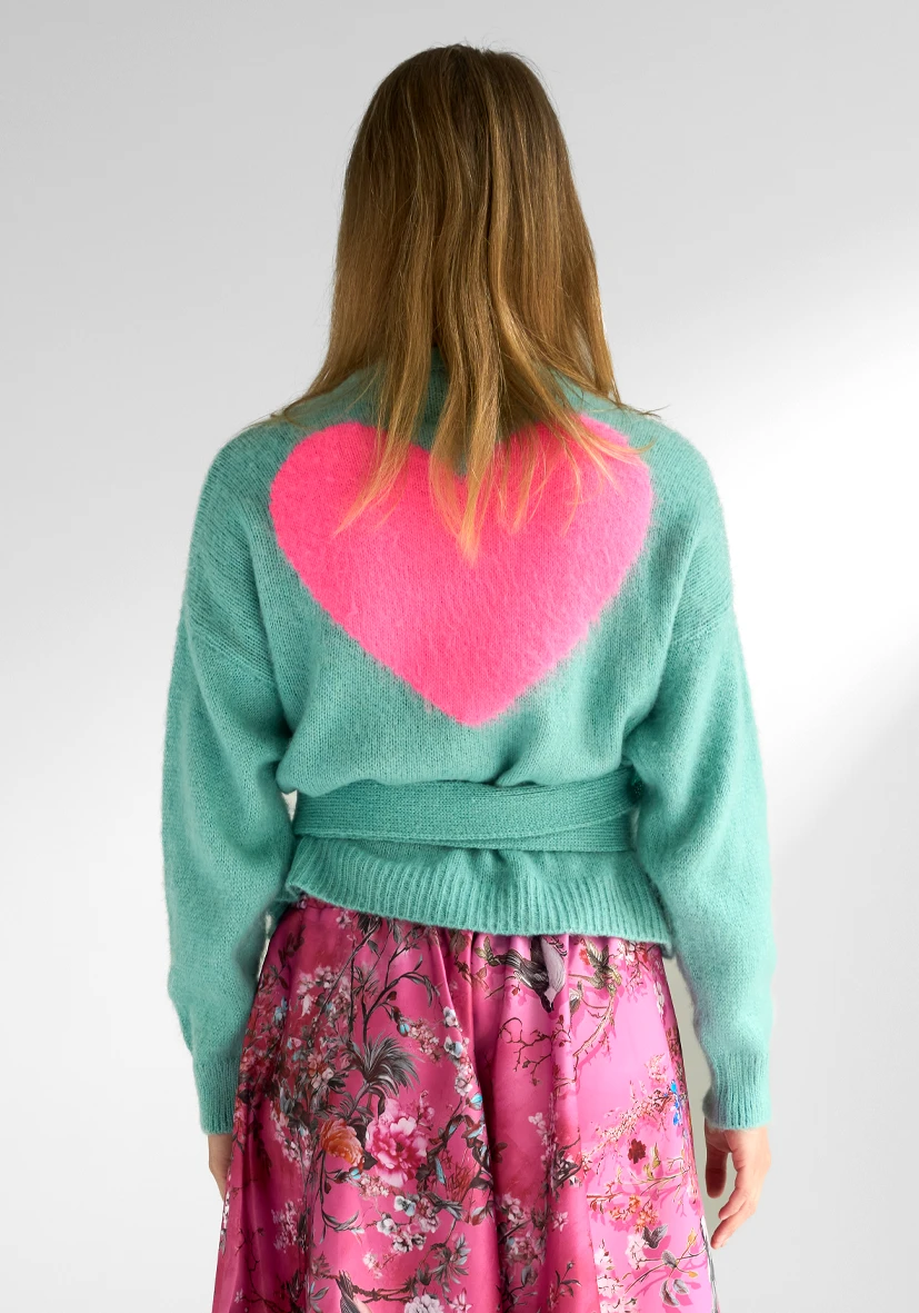 Kuschelig weicher Pullover aus gebürsteter Wollmischung in Wickel-Optik. Hüftlang geschnitten und mit Bindegürtel auf Taille tragbar. Highlight: ein großes, eingestricktes Herz auf dem Rücken. Perfekt für einen femininen, verspielten Look.