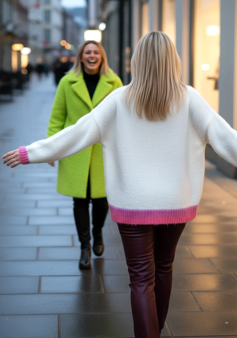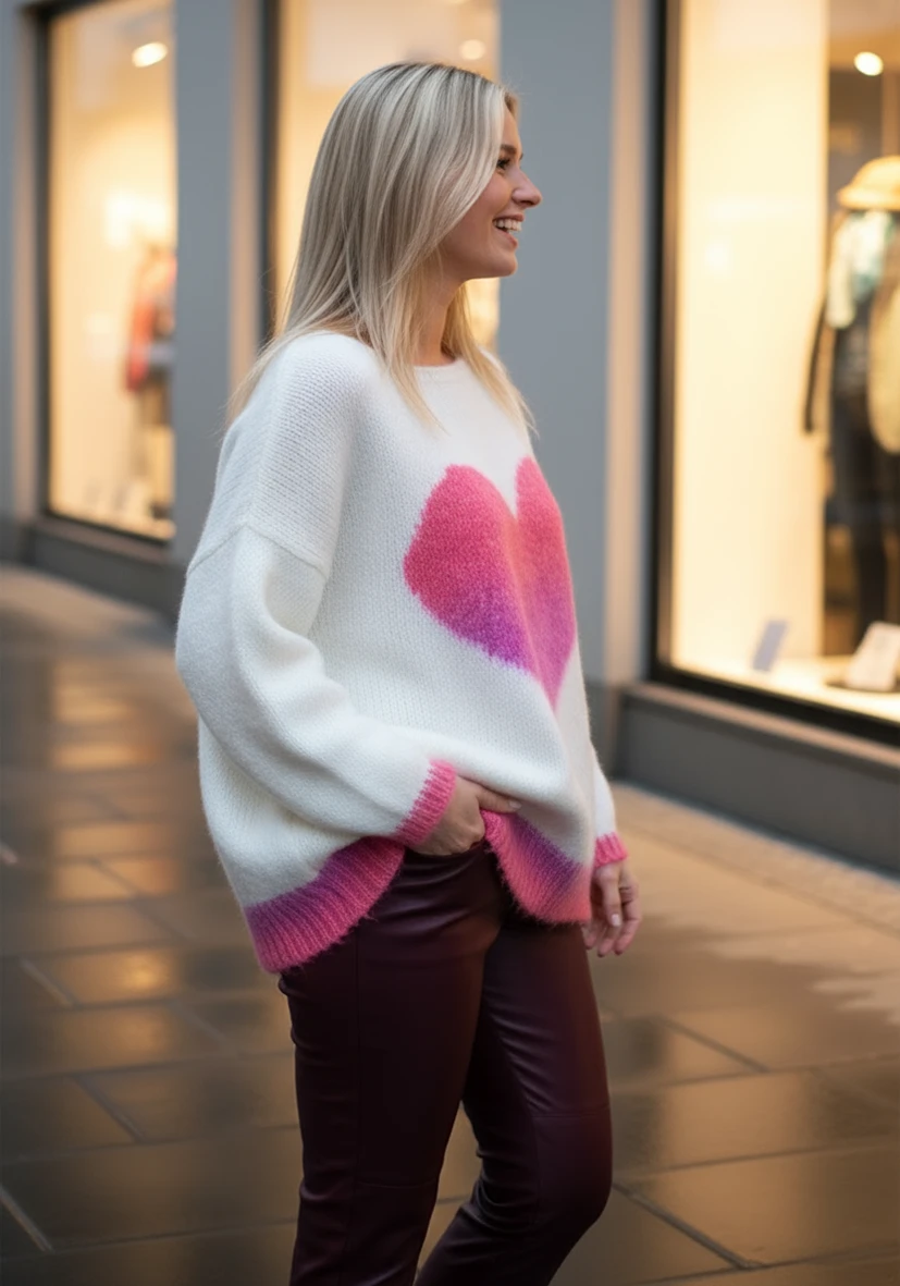 Locker fallender Strickpullover mit großem Herz als Intarsienstrick, das Material ist leicht gebrushed, absolut leicht und kuschelig,