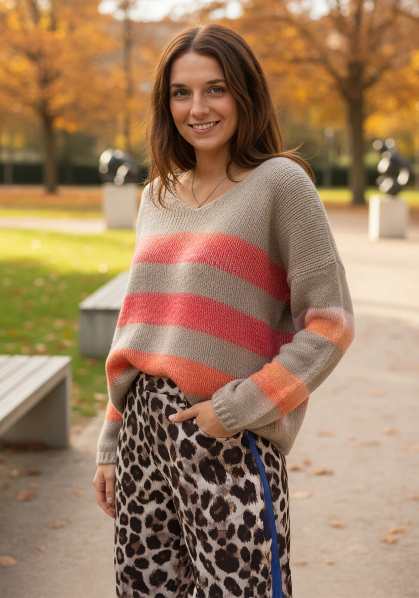 Leichter Strickpullover mit eingestrickten Streifenverläufen. Aus gebrushter Wolle – superweich, kuschelig und angenehm zu tragen. Jedes Stück ein Unikat: Der Farbverlauf variiert durch die aufwendige Stricktechnik und macht jeden Pullover einzigartig.