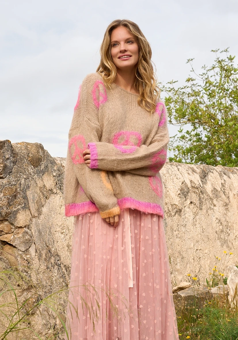 Kuscheliger Strickpullover mit kleinen Peacezeichen-Intarsien. Leichtes Material und besonders angenehm zu tragen. Farbverlauf an Bund, Kragen und Saum sorgt für einen besonderen Look.
