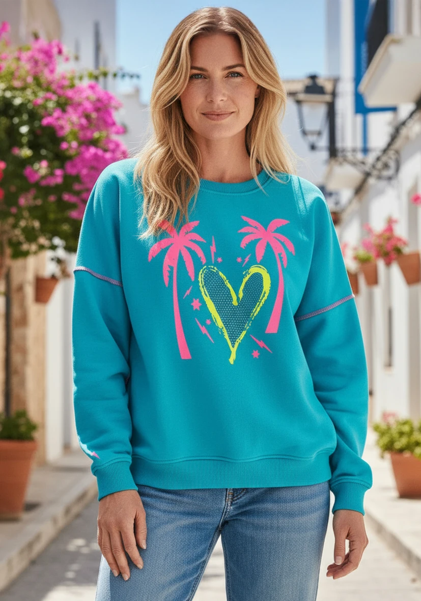 Sweatshirt mit Rundhals-Ausschnitt, großflächigem neonfarbenem Print mit Strass-Steinchen vorne und großem Neonprint auf der Rückseite. Kontrastnähte und breite, bequeme Bündchen.
