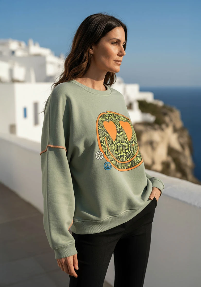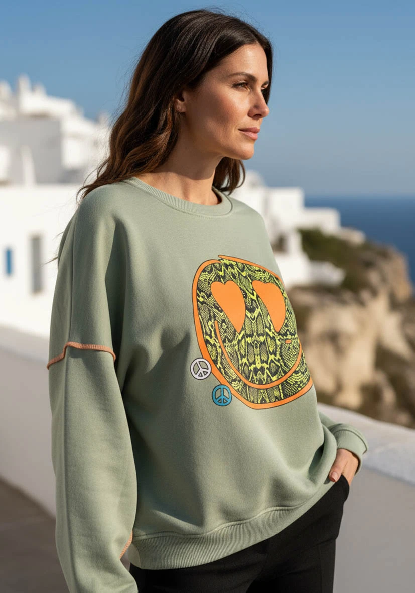 Oversized Sweater mit Rundhals-Ausschnitt und Heartface-Motiv mit Schlangenmuster. Farbig abgesetzte Kontrastnähte, breiter Saum am Bund und aus angenehm weichem Baumwollmaterial.