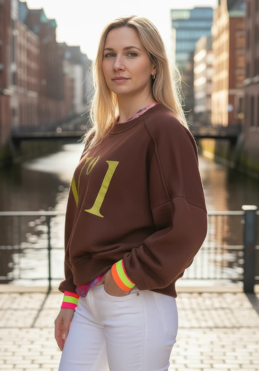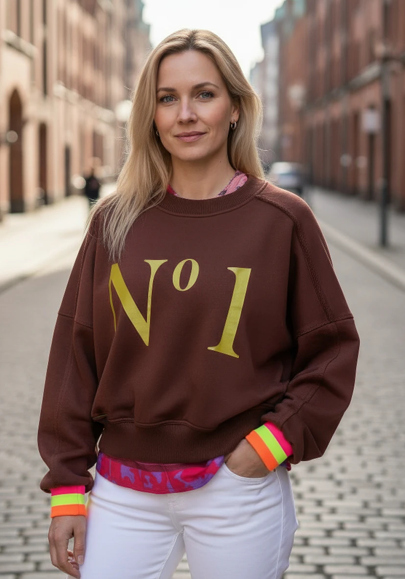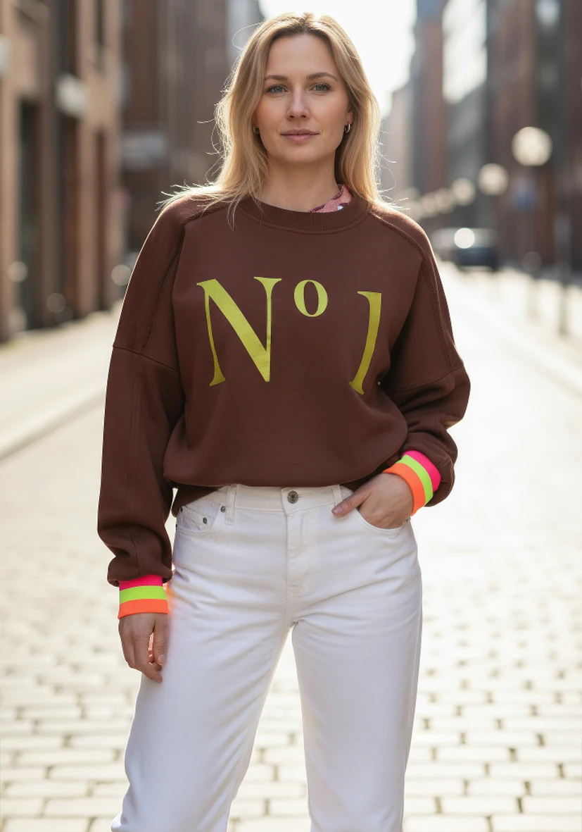 Trendiger Sweater in Schokobraun mit goldenem Type-Print. Der lockere, feminine Schnitt mit leichtem Oversize-Fit und überschnittenen Schultern sorgt für lässigen Komfort. Neonfarbene Collegecuff-Bündchen setzen moderne Akzente. Perfekt kombinierbar – ein echtes Statement-Piece!