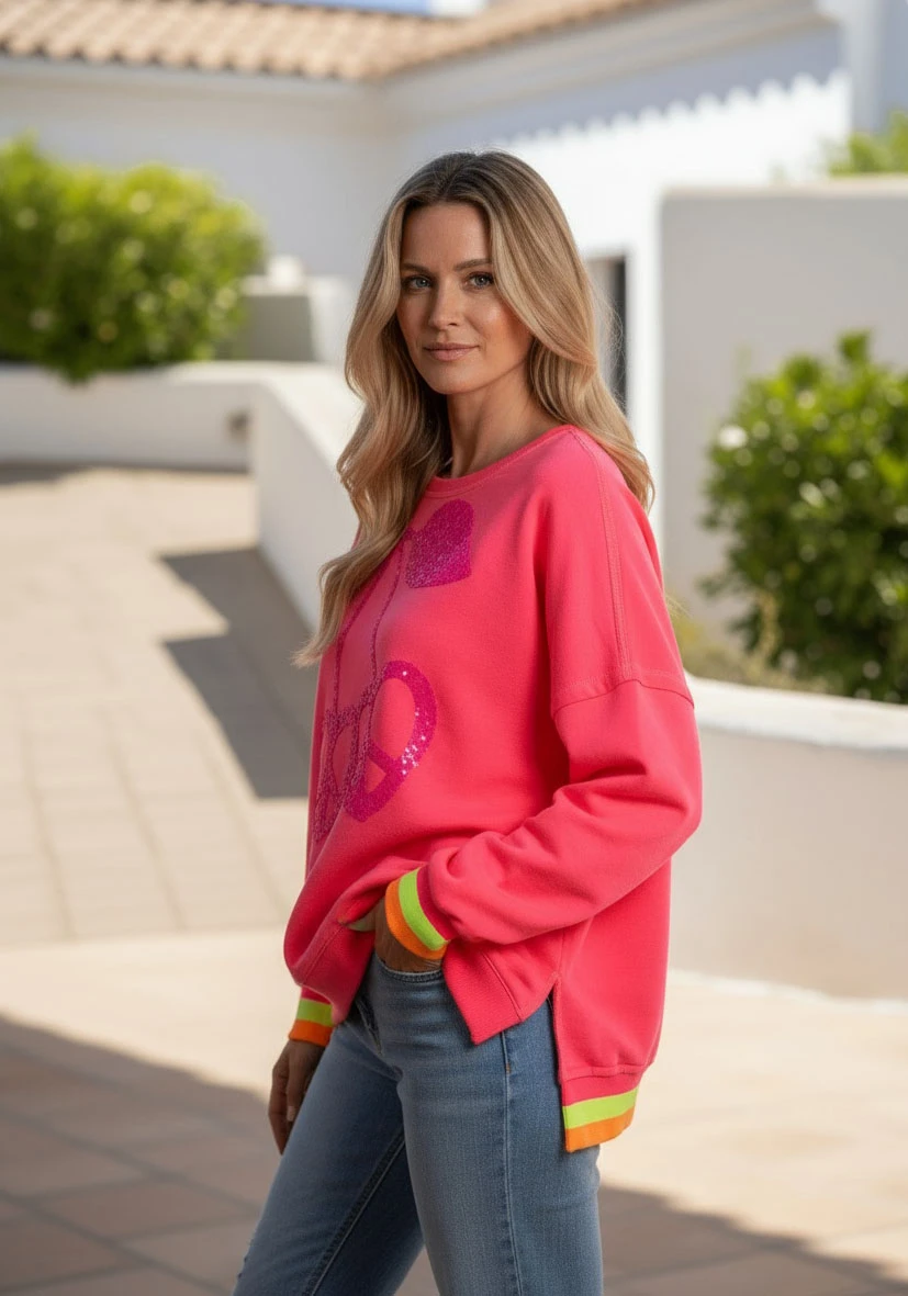Neonpinker Sweater mit Rundhals-Ausschnitt und wunderschöner Strass-Applikation. Seitlich geschlitzt für eine lässige Passform, mit neonfarbenen Collegecuff-Bündchen und längerem Rückenteil.