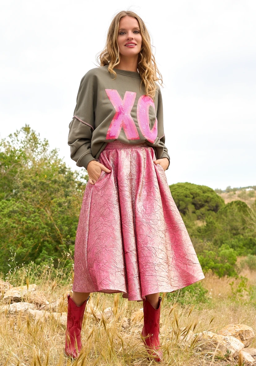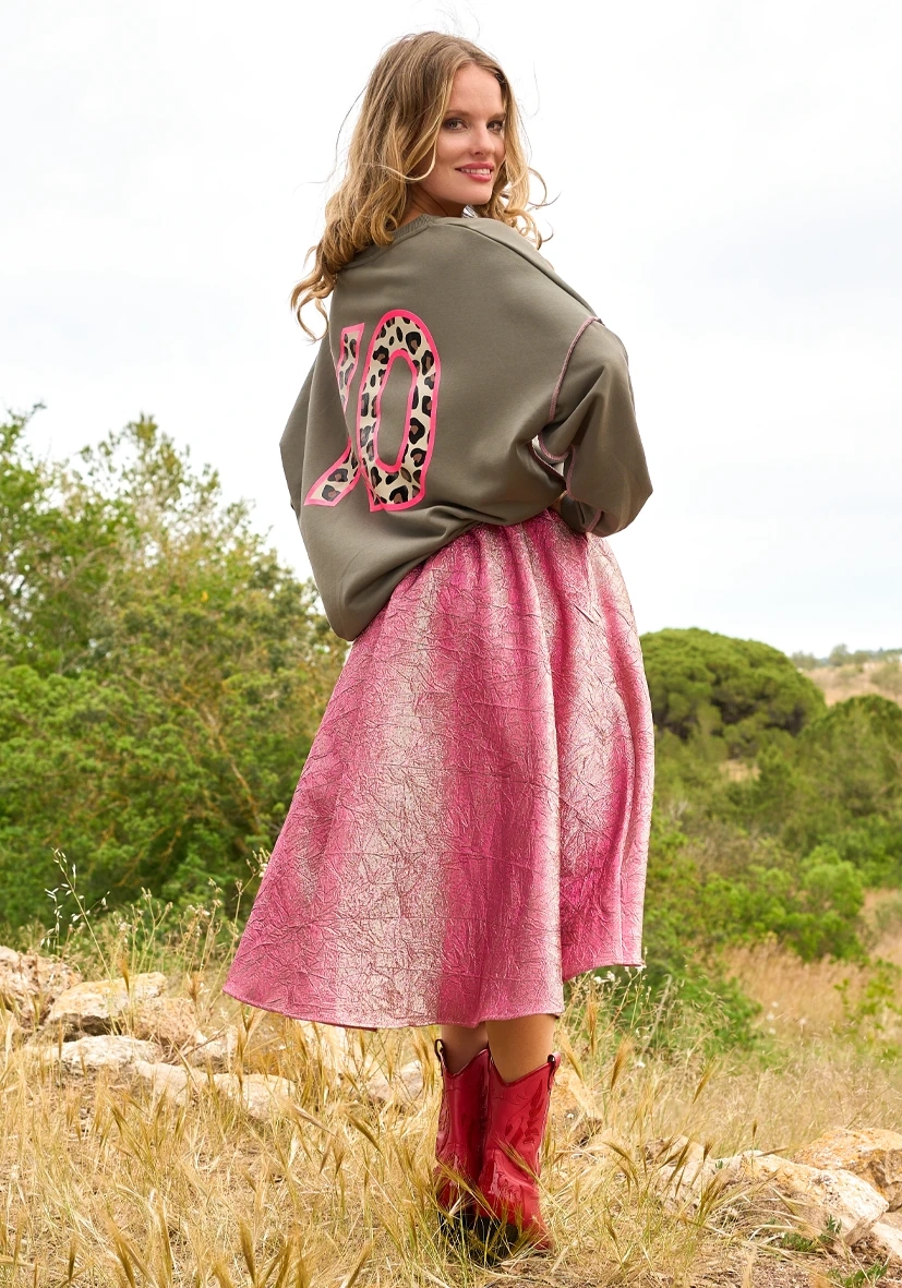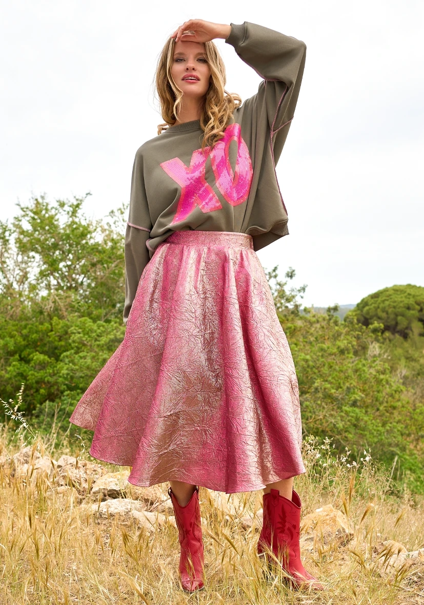 Dieser Midirock im Roseton kombiniert Glanz, Farbe und Struktur zu einem einzigartigen Statement-Piece. Der weich fließende Schnitt in A-Linie bringt Dynamik in deinen Style, während der elastische Bund für maximalen Tragekomfort sorgt.