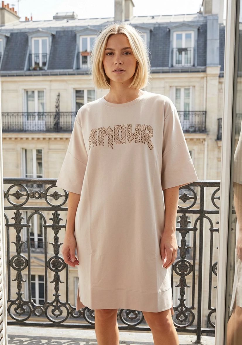 Dieses lässige T-Shirtkleid bringt sommerliche Leichtigkeit in deinen Alltag! Mit seinem lockeren Oversize-Schnitt, den weiten Ärmeln und dem verspielten Druck, ist es das perfekte Piece für entspannte Tage mit Stil. Das weiche, hochwertige Material sorgt für maximalen Tragekomfort.