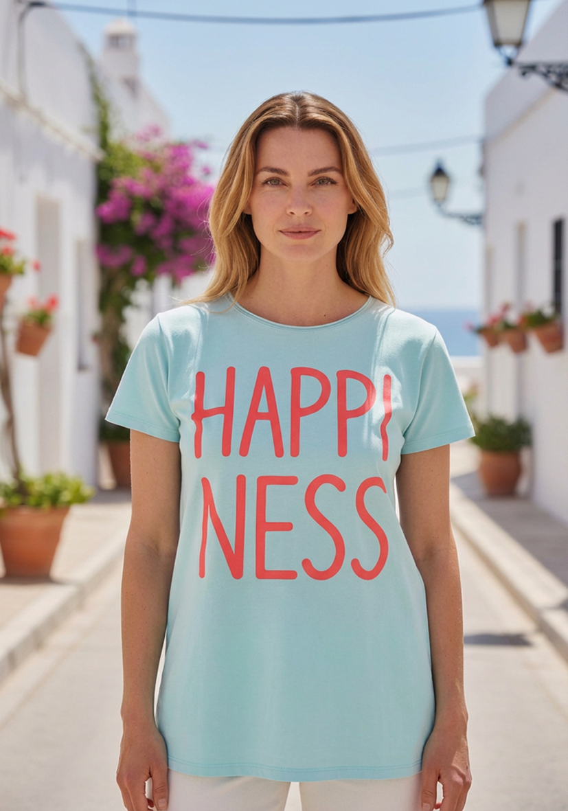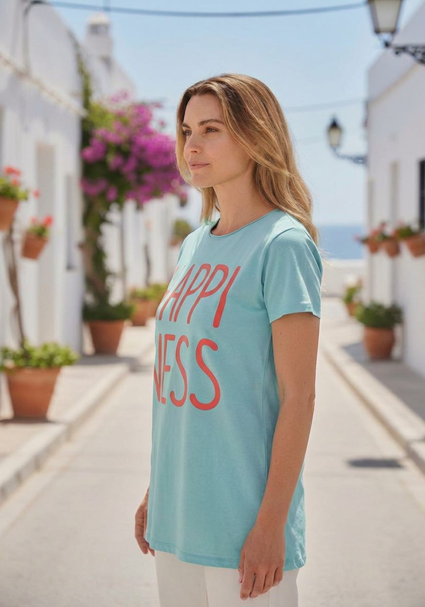 Hellblaues T-Shirt mit mit großem Type-Print auf der Vorderseite. Der körperumspielende Schnitt sorgt für einen angenehmen, lässigen Tragekomfort.