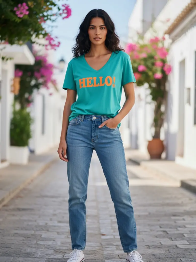 Graues T-Shirt mit Rundhals-Ausschnitt. Die Vorderseite ziert ein auffälliger Type-Print, ergänzt durch eine filigrane Lotusblüte aus funkelnden Strass-Steinchen. Der körperumspielende Schnitt sorgt für eine feminine Silhouette und hohen Tragekomfort.