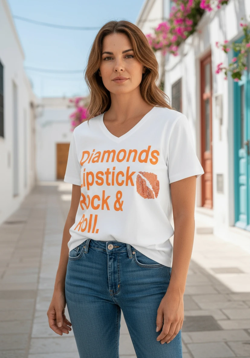 T-Shirt V-Neck Diamonds Lipstick Rock and Roll – white