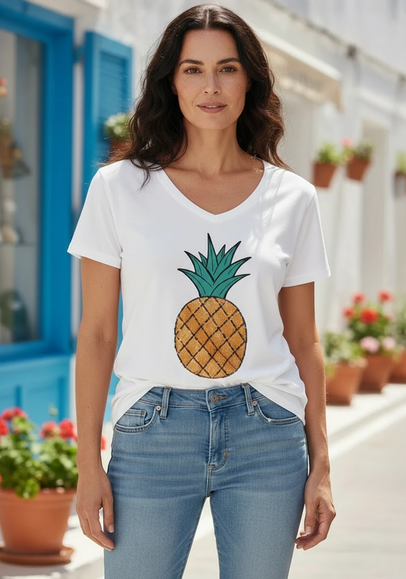 Weißes T-Shirt mit V-Ausschnitt und großem Ananas-Print mit Paillettenstickerei auf der Vorderseite. Der körperumspielende Schnitt sorgt für einen angenehmen, lässigen Tragekomfort.