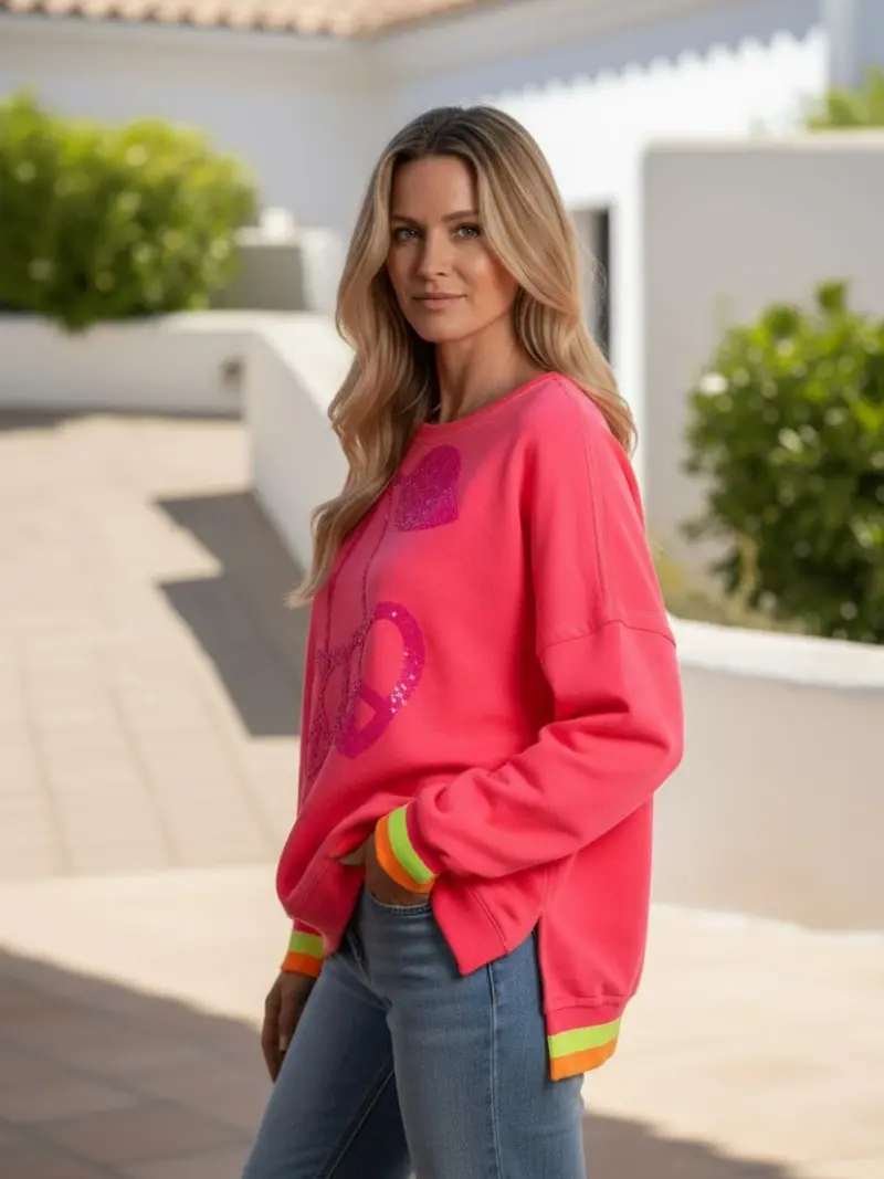 Sweater mit V-Ausschnitt und wunderschöner Strass-Applikation. Seitlich geschlitzt für eine lässige Passform, mit neonfarbenen Collegecuff-Bündchen und längerem Rückenteil.