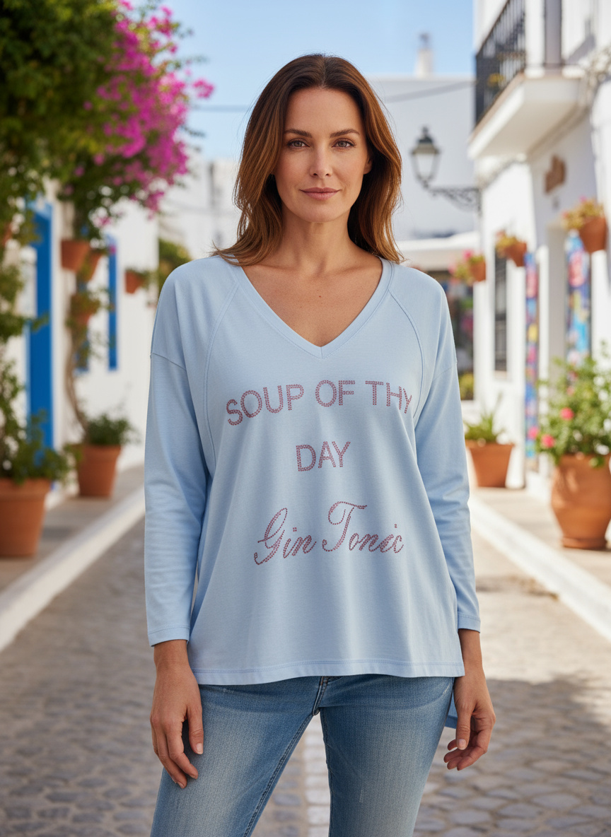 Hellblaues Langarm-Shirt mit V-Neck aus luftigem Stoff mit funkelnder Strass-Applikation vorne. Körperumspielender Schnitt für bequemen Sitz.