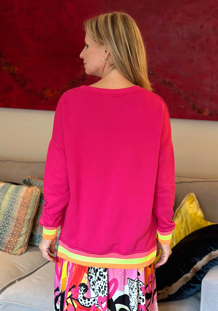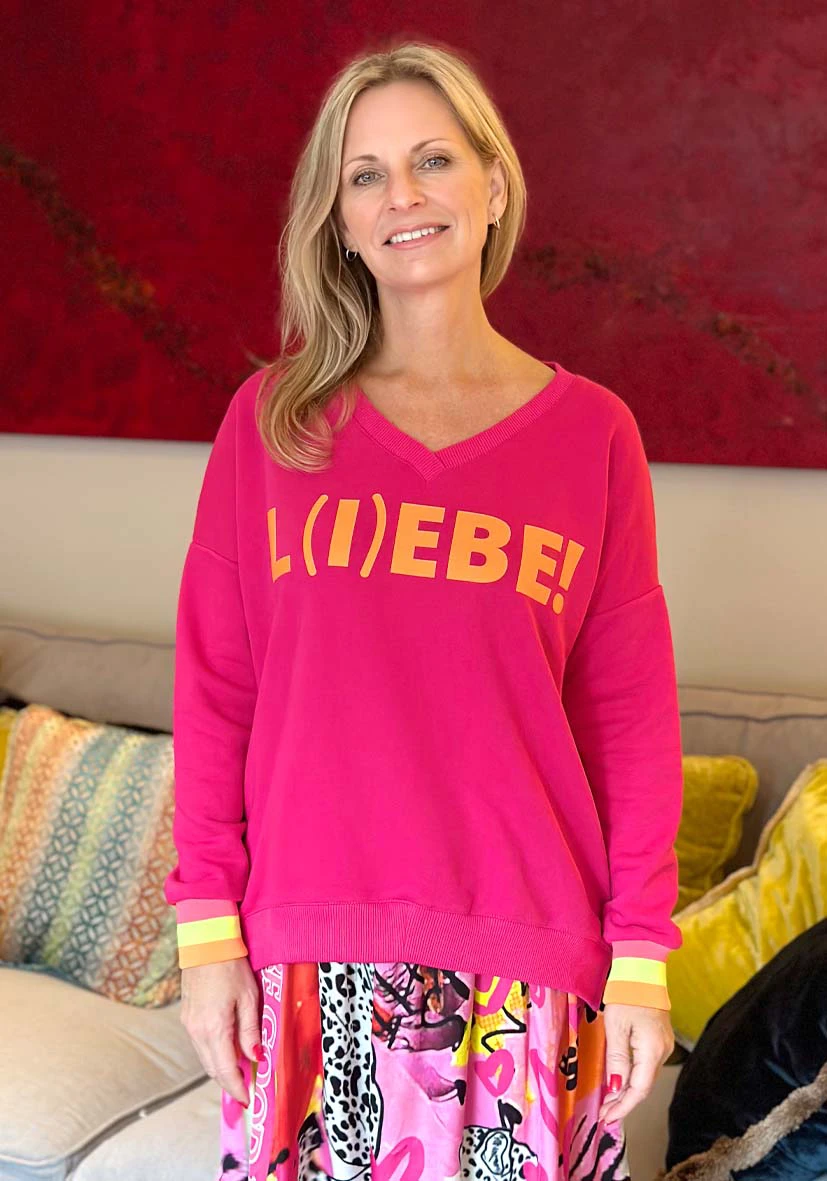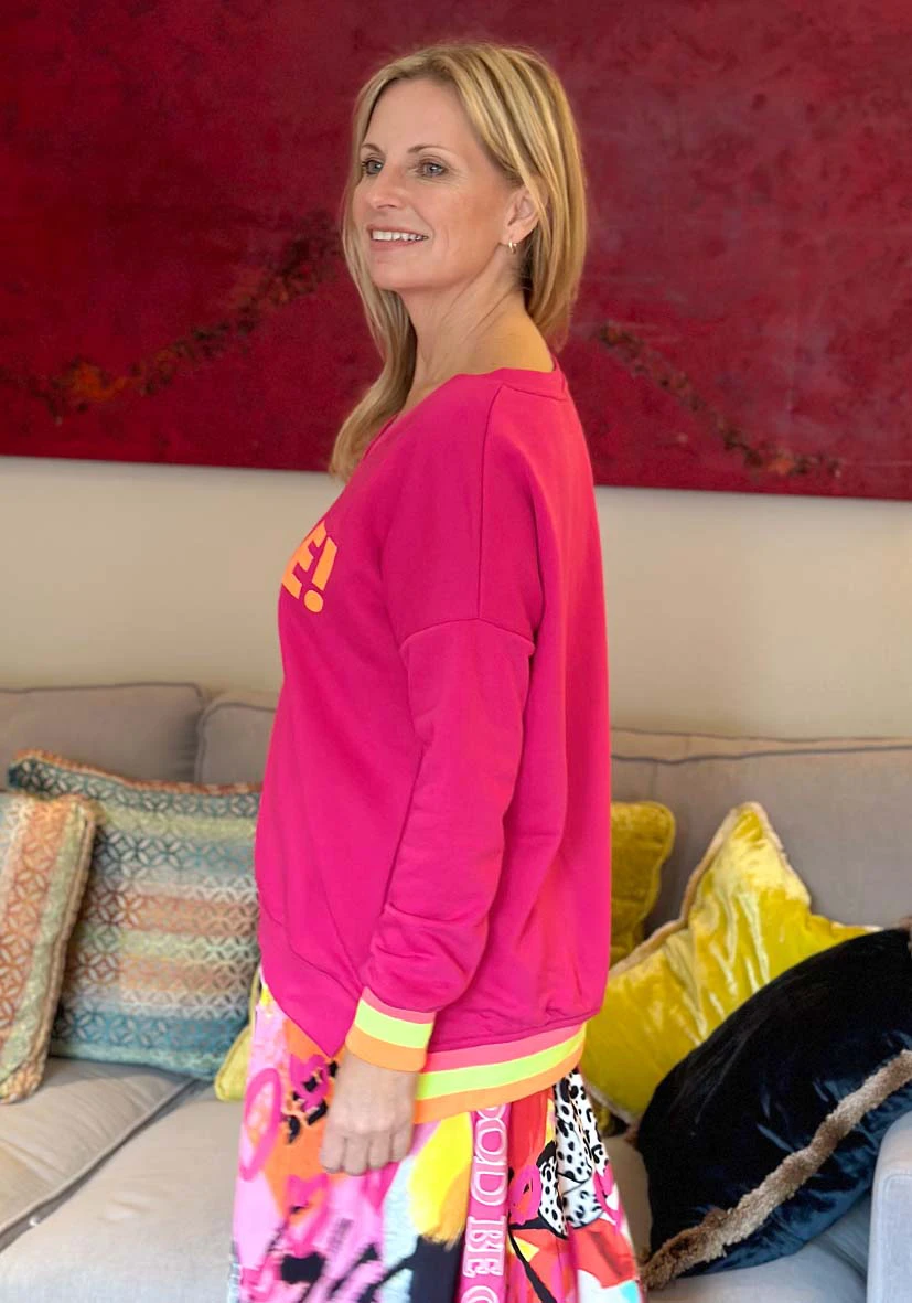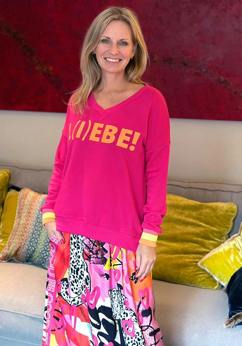 V-Neck mit College-Cuffs, großflächiger Druck, seitlich geschlitzt, länger geschnittenes Rückenteil, magenta, neonorange, 100 % Baumwolle