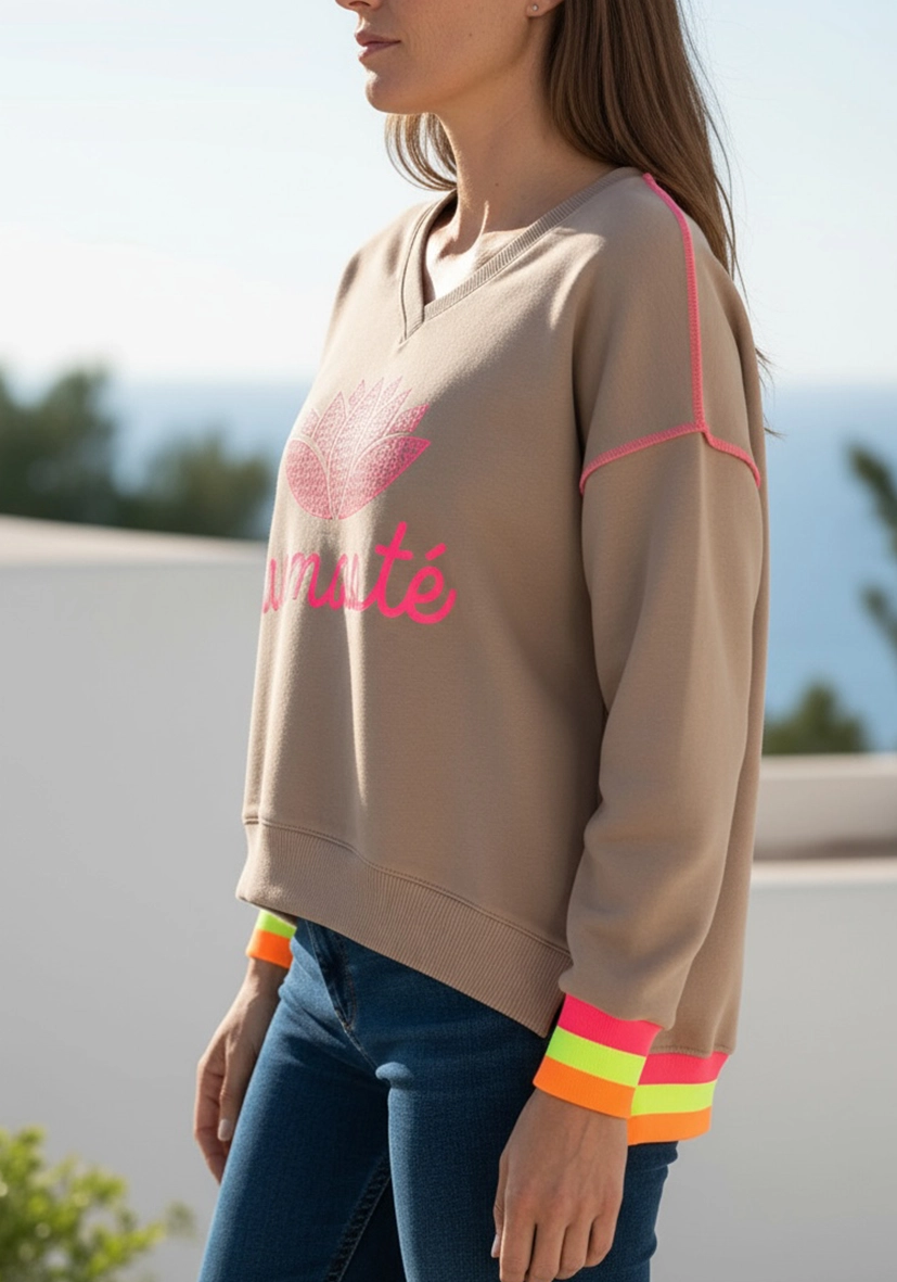 Sweater mit V-Ausschnitt und großflächigem Druck mit Strasssteinchen. Auffällige Jaquard-Bündchen und ein lässiger Schnitt für eine stylische Optik. Ideal zu Jeans oder sportlichen Looks.